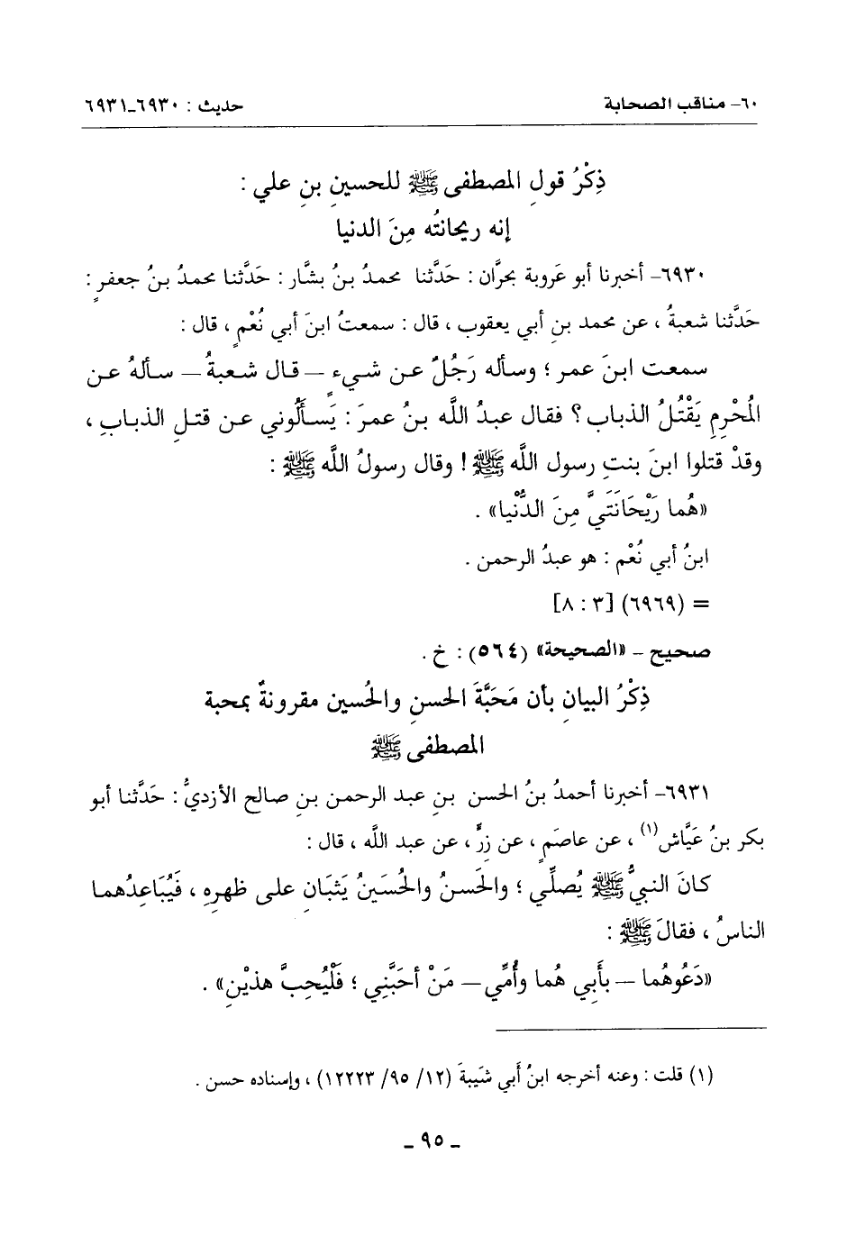 ذِكْرُ قَوْلِ الْمُصْطَفَى صَلَّى اللَّهُ عَلَيْهِ وَسَلَّمَ لِلْحُسَيْنِ بْنِ عَلِيٍّ: (إِنَّهُ ريحانتُه مِنَ الدُّنْيَا)