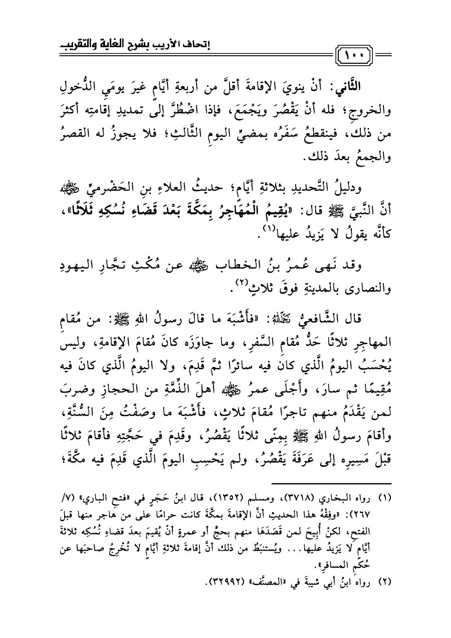 (¬١) رواه البخاري (٣٧١٨)، ومسلم (١٣٥٢)، قال ابنُ حَجَرٍ في «فتحِ الباري» (٧/ ٢٦٧): «وفِقْهُ هذا الحديثِ أنَّ الإقامةَ بمكَّةَ كانت حرامًا على من هاجر منها قبلَ الفتحِ، لكنْ أُبِيحَ لمن قَصَدَهَا منهم بحجٍّ أو عمرةٍ أنْ يُقيمَ بعدَ قضاءِ نُسُكِه ثلاثةَ أيَّامٍ لا يَزيدُ عليها ... ويُستنبَطُ من ذلك أنَّ إقامةَ ثلاثةِ أيَّامٍ لا تُخْرِجُ صاحبَها عن حُكمِ المسافرِ».