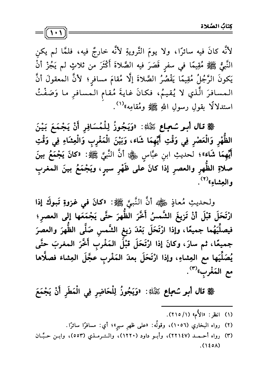 قال أبو شجاع رحمه الله: «وَيَجُوزُ لِلْمُسَافِرِ أَنْ يَجْمَعَ بَيْنَ الظُّهْرِ وَالْعَصْرِ فِي وَقْتِ أَيِّهِمَا شَاءَ، وَبَيْنَ الْمَغْرِبِ وَالْعِشَاءِ فِي وَقْتِ أَيِّهِمَا شَاءَ»؛ لحديثِ ابنِ عبَّاسٍ رضي الله عنهما أنَّ النَّبيَّ صلى الله عليه وسلم: «كانَ يَجْمَعُ بينَ صلاةِ الظُّهرِ والعصرِ إذا كانَ على ظَهْرِ سيرٍ، ويَجْمَعُ بينَ المغربِ والعِشاءِ» (¬٢).
