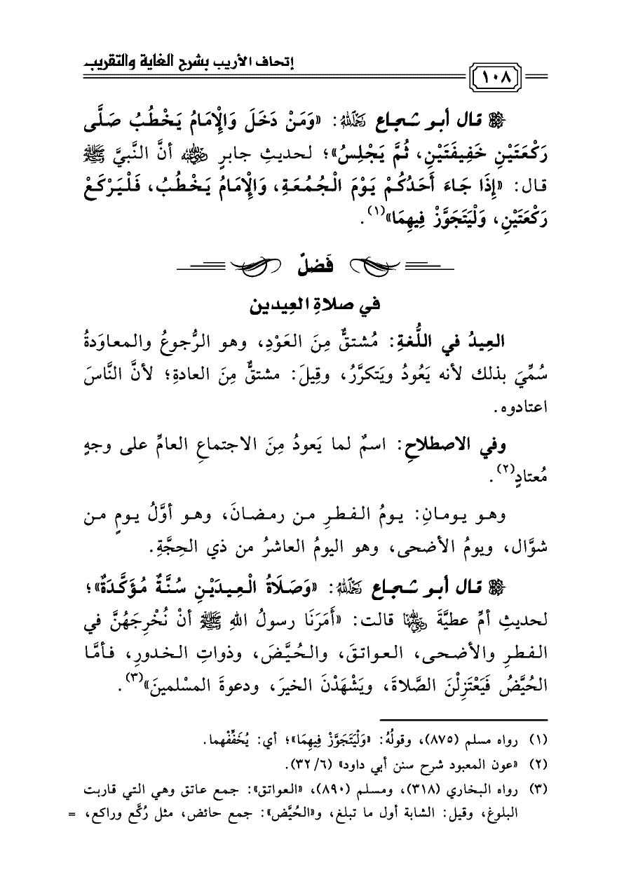 قال أبو شجاع رحمه الله: «وَصَلَاةُ الْعِيدَيْنِ سُنَّةٌ مُؤَكَّدَةٌ»؛ لحديثِ أمِّ عطيَّةَ رضي الله عنها قالت: «أَمَرَنَا رسولُ اللهِ صلى الله عليه وسلم أنْ نُخْرِجَهُنَّ في الفطرِ والأضحى، العواتقَ، والحُيَّضَ، وذواتِ الخدورِ، فأمَّا الحُيَّضُ فَيَعْتَزِلْنَ الصَّلاةَ، ويَشْهَدْنَ الخيرَ، ودعوةَ المسْلمينَ» (¬٣).