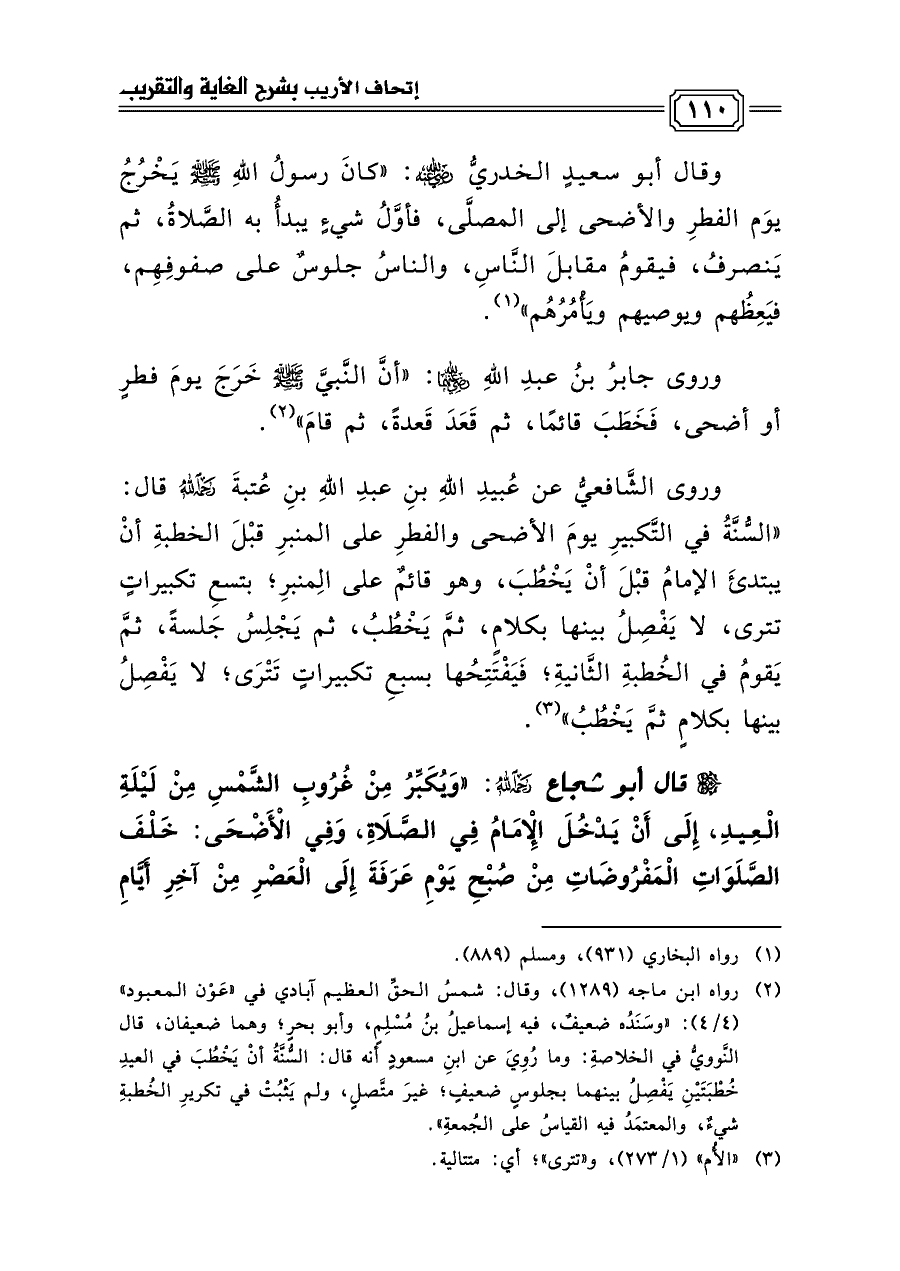 وقال أبو سعيدٍ الخدريُّ رضي الله عنه: «كانَ رسولُ اللهِ صلى الله عليه وسلم يَخْرُجُ يوَم الفطرِ والأضحى إلى المصلَّى، فأوَّلُ شيءٍ يبدأُ به الصَّلاةُ، ثم يَنصرفُ، فيقومُ مقابلَ النَّاسِ، والناسُ جلوسٌ على صفوفِهِم، فيَعِظُهم ويوصيهم ويَأْمُرُهُم» (¬١).