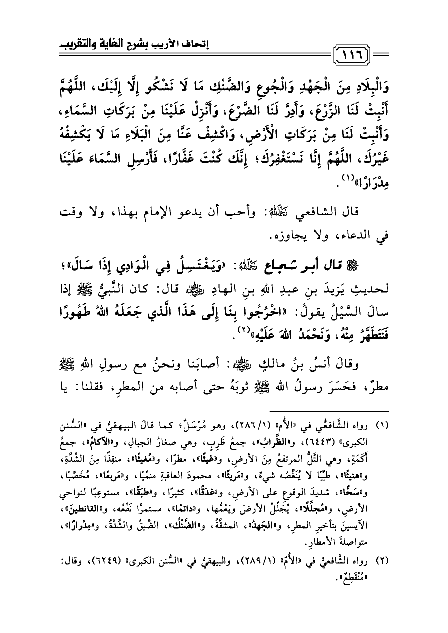 (¬١) رواه الشَّافعُّي في «الأُم» (١/ ٢٨٦)، وهو مُرْسَلٌ؛ كما قالَ البيهقيُّ في «السُّنن الكبرى» (٦٤٤٣)، و «الظِّرابُ»، جمعُ ظَرِبٍ، وهي صغارُ الجبالِ، و «الآكامُ»، جمعُ أَكَمَةٍ، وهي التَّلُّ المرتفعُ مِنَ الأرضِ، و «غيثًا»، مطرًا، و «مُغيثًا»، منقِذًا مِنَ الشِّدَّةِ، و «هنيئًا»، طيِّبًا لا يُنَغِّصُه شيءٌ، و «مَريئًا»، محمودَ العاقبةِ منمِّيًا، و «مَريعًا»، مُخَصِّبًا، و «سَحًّا»، شديدَ الوقوعِ على الأرضِ، و «غدَقًا»، كثيرًا، و «طبَقًا»، مستوعِبًا لنواحي الأرضِ، و «مُجلِّلًا»، يُجَلِّلُ الأرضَ ويَعُمُّها، و «دائمًا»، مستمرًّا نَفْعُه، و «القانطينَ»، الآيسينَ بتأخيرِ المطرِ، و «الجَهدُ»، المشقَّةُ، و «الضَّنْكُ»، الضِّيقُ والشِّدَّةُ، و «مِدْرارًا»، متواصلةَ الأمطارِ.