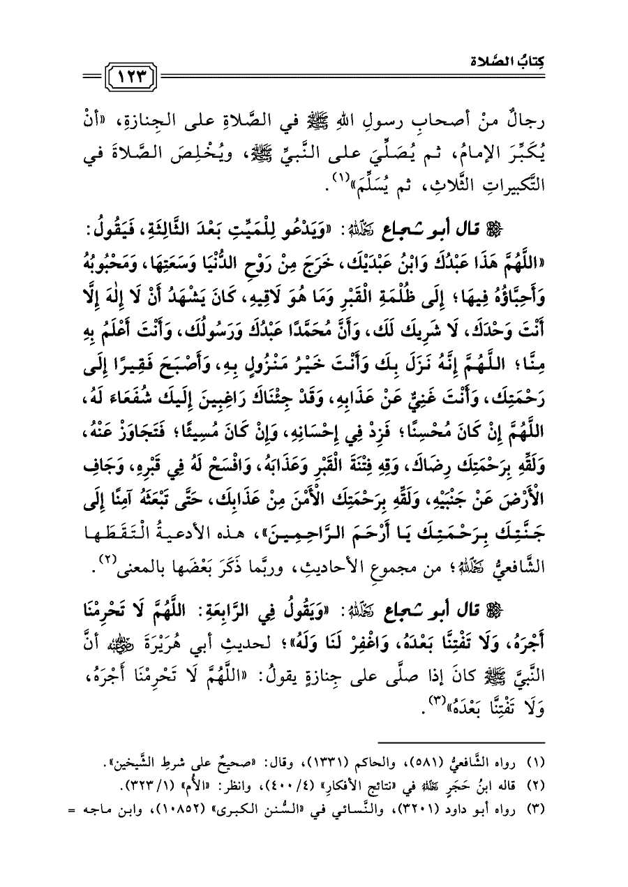 قال أبو شجاع رحمه الله: «وَيَدْعُو لِلْمَيِّتِ بَعْدَ الثَّالِثَةِ، فَيَقُولُ: «اللَّهُمَّ هَذَا عَبْدُكَ وَابْنُ عَبْدَيْكَ، خَرَجَ مِنْ رَوْحِ الدُّنْيَا وَسَعَتِهَا، وَمَحْبُوبُهُ وَأَحِبَّاؤُهُ فِيهَا؛ إِلَى ظُلْمَةِ الْقَبْرِ وَمَا هُوَ لَاقِيهِ، كَانَ يَشْهَدُ أَنْ لَا إِلَهَ إِلَّا أَنْتَ وَحْدَكَ، لَا شَرِيكَ لَكَ، وَأَنَّ مُحَمَّدًا عَبْدُكَ وَرَسُولُكَ، وَأَنْتَ أَعْلَمُ بِهِ مِنَّا؛ اللَّهُمَّ إِنَّهُ نَزَلَ بِكَ وَأَنْتَ خَيْرُ مَنْزُولٍ بِهِ، وَأَصْبَحَ فَقِيرًا إِلَى رَحْمَتِكَ، وَأَنْتَ غَنِيٌّ عَنْ عَذَابِهِ، وَقَدْ جِئْنَاكَ رَاغِبِينَ إِلَيكَ شُفَعَاءَ لَهُ، اللَّهُمَّ إِنْ كَانَ مُحْسِنًا؛ فَزِدْ فِي إِحْسَانِهِ، وَإِنْ كَانَ مُسِيئًا؛ فَتَجَاوَزْ عَنْهُ، وَلَقِّهِ بِرَحْمَتِكَ رِضَاكَ، وَقِهِ فِتْنَةَ الْقَبْرِ وَعَذَابَهُ، وَافْسَحْ لَهُ فِي قَبْرِهِ، وَجَافِ الْأَرْضَ عَنْ جَنْبَيْهِ، وَلَقِّهِ بِرَحْمَتِكَ الْأَمْنَ مِنْ عَذَابِكَ، حَتَّى تَبْعَثَهُ آمِنًا إِلَى جَنَّتِكَ بِرَحْمَتِكَ يَا أَرْحَمَ الرَّاحِمِينَ»، هذه الأدعيةُ الْتَقَطَها الشَّافعيُّ رحمه الله؛ من مجموعِ الأحاديثِ، وربَّما ذَكَرَ بَعْضَها بالمعنى (¬٢).