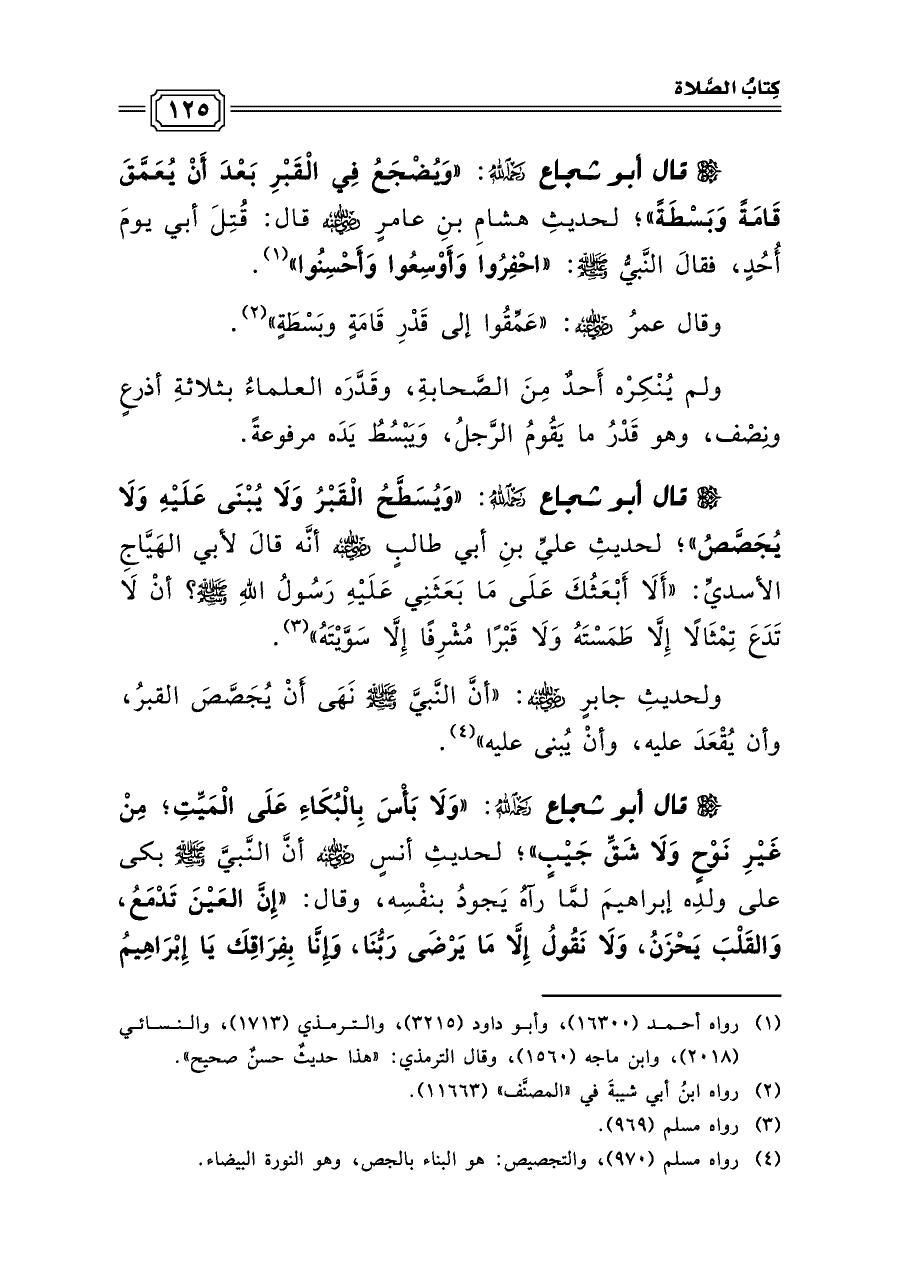 قال أبو شجاع رحمه الله: «وَيُسَطَّحُ الْقَبْرُ وَلَا يُبْنَى عَلَيْهِ وَلَا يُجَصَّصُ»؛ لحديثِ عليِّ بنِ أبي طالبٍ رضي الله عنه أنَّه قالَ لأبي الهَيَّاجِ الأسديِّ: «أَلَا أَبْعَثُكَ عَلَى مَا بَعَثَنِي عَلَيْهِ رَسُولُ اللهِ صلى الله عليه وسلم؟ أنْ لَا تَدَعَ تِمْثَالًا إِلَّا طَمَسْتَهُ وَلَا قَبْرًا مُشْرِفًا إِلَّا سَوَّيْتَهُ» (¬٣).