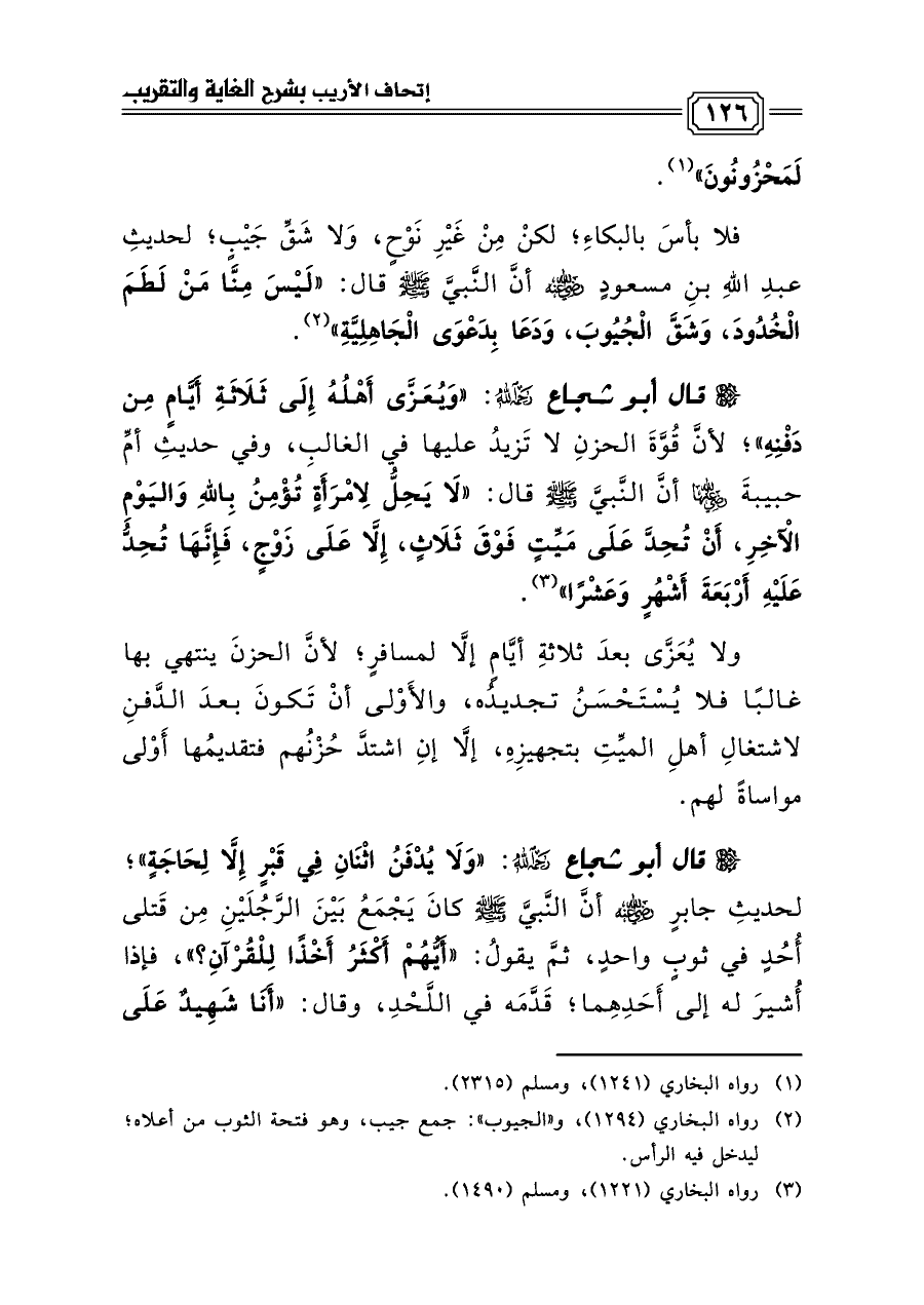 قال أبو شجاع رحمه الله: «وَيُعَزَّى أَهْلُهُ إِلَى ثَلَاثَةِ أَيَّامٍ مِن دَفْنِهِ»؛ لأنَّ قُوَّةَ الحزنِ لا تَزيدُ عليها في الغالبِ، وفي حديثِ أمِّ حبيبةَ رضي الله عنها أنَّ النَّبيَّ صلى الله عليه وسلم قال: «لَا يَحِلُّ لِامْرَأَةٍ تُؤْمِنُ بِاللهِ وَاليَوْمِ الْآخِرِ، أَنْ تُحِدَّ عَلَى مَيِّتٍ فَوْقَ ثَلَاثٍ، إِلَّا عَلَى زَوْجٍ، فَإِنَّهَا تُحِدُّ عَلَيْهِ أَرْبَعَةَ أَشْهُرٍ وَعَشْرًا» (¬٣).