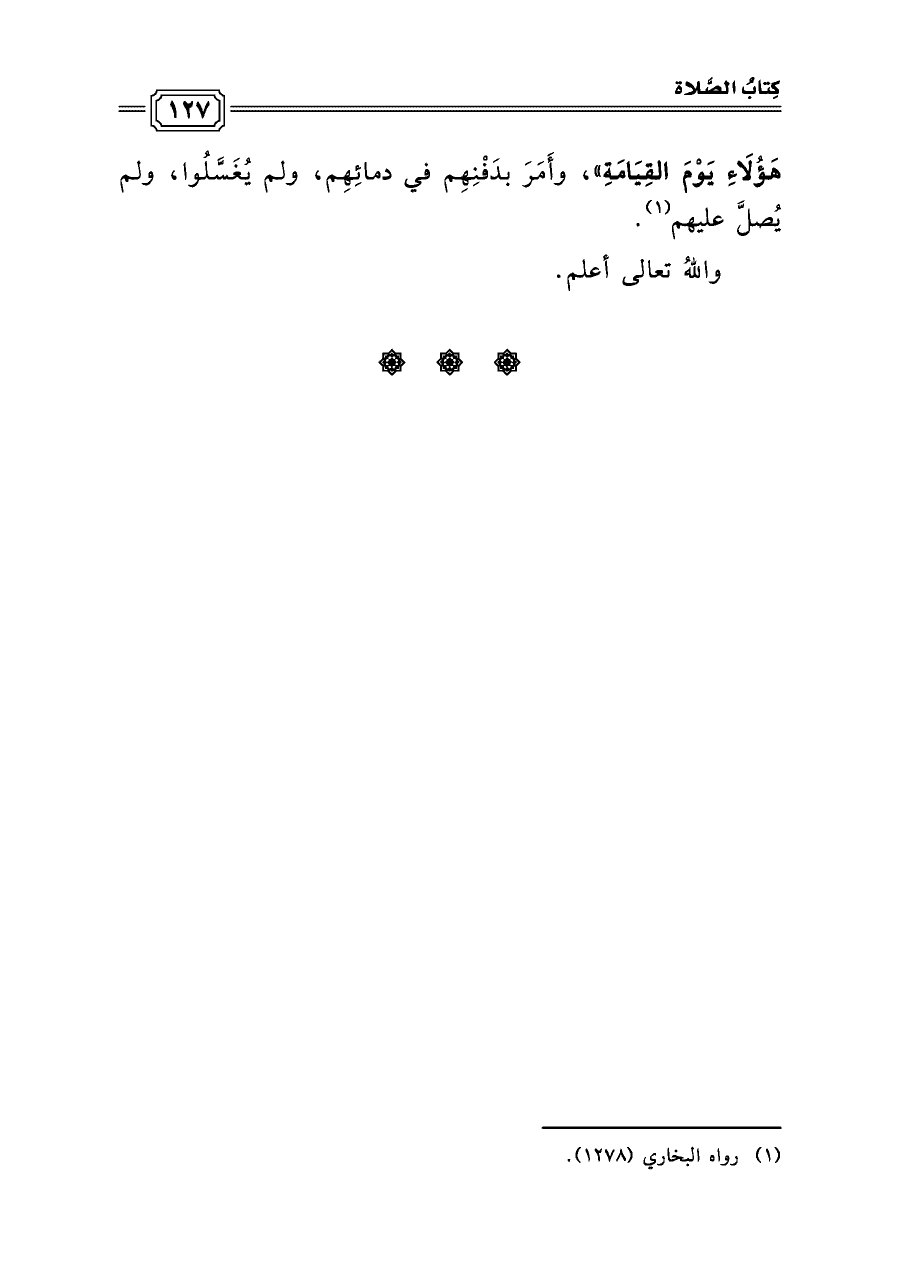 هَؤُلَاءِ يَوْمَ القِيَامَةِ»، وأَمَرَ بدَفْنِهِم في دمائِهِم، ولم يُغَسَّلُوا، ولم يُصلَّ عليهم (¬١).