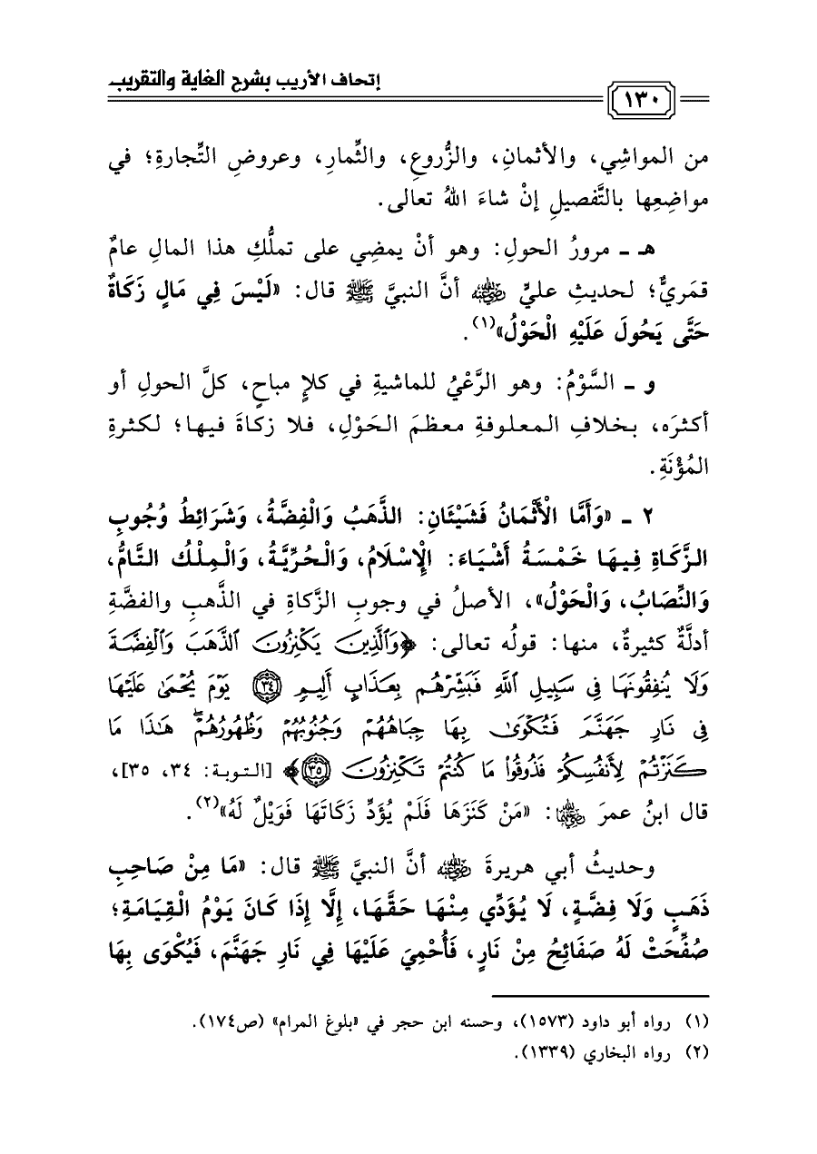 ٢ - «وَأَمَّا الْأَثْمَانُ فَشَيْئَانِ: الذَّهَبُ وَالْفِضَّةُ، وَشَرَائِطُ وُجُوبِ الزَّكَاةِ فِيهَا خَمْسَةُ أَشْيَاءَ: الْإِسْلَامُ، وَالْحُرِّيَّةُ، وَالْمِلْكُ التَّامُّ، وَالنِّصَابُ، وَالْحَوْلُ»، الأصلُ في وجوبِ الزَّكاةِ في الذَّهبِ والفضَّةِ أدلَّةٌ كثيرةٌ، منها: قولُه تعالى: {وَالَّذِينَ يَكْنِزُونَ الذَّهَبَ وَالْفِضَّةَ وَلَا يُنْفِقُونَهَا فِي سَبِيلِ اللهِ فَبَشِّرْهُمْ بِعَذَابٍ أَلِيمٍ (٣٤) يَوْمَ يُحْمَى عَلَيْهَا فِي نَارِ جَهَنَّمَ فَتُكْوَى بِهَا جِبَاهُهُمْ وَجُنُوبُهُمْ وَظُهُورُهُمْ هَذَا مَا كَنَزْتُمْ لِأَنْفُسِكُمْ فَذُوقُوا مَا كُنْتُمْ تَكْنِزُونَ} [التوبة: ٣٤]، قال ابنُ عمرَ رضي الله عنهما: «مَنْ كَنَزَهَا فَلَمْ يُؤَدِّ زَكَاتَهَا فَوَيْلٌ لَهُ» (¬٢).