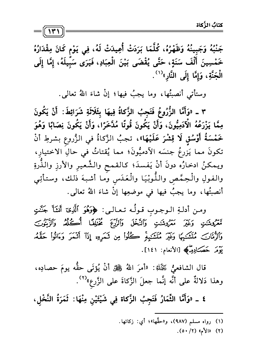 ٣ - «وَأَمَّا الزُّرُوعُ فَتَجِبُ الزَّكاةُ فِيهَا بِثَلَاثَةِ شَرَائِطَ: أَنْ يَكُونَ مِمَّا يَزْرَعُهُ الْآدَمِيُّونَ، وَأَنْ يَكُونَ قُوتًا مُدَّخَرًا، وَأَنْ يَكُونَ نِصَابًا وَهُوَ خَمْسَةُ أَوْسُقٍ لَا قِشْرَ عَلَيْهَا»، تجبُ الزَّكاةُ في الزُّروعِ بشرطِ أنْ تكونَ مما يَزرعُ جنسَه الآدميُّونَ؛ مما يُقتاتُ في حالِ الاختيارِ، ويمكنُ ادخارُه دونَ أنْ يَفسدَ؛ كالقمحِ والشَّعيرِ والأرزِ والذُّرةِ والفولِ والْحِمَّصِ واللُّوبْيَا والْعَدَسِ وما أشبهَ ذلك، وستأتِي أنصبتُها، وما يجبُ فيها في موضعِها إنْ شاءَ اللهُ تعالى.