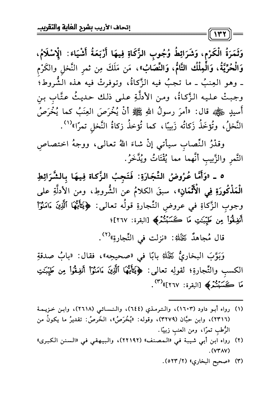 وَثَمَرَةُ الْكَرْمِ، وَشَرَائِطُ وُجُوبِ الزَّكَاةِ فِيهَا أَرْبَعَةُ أَشْيَاءَ: الْإِسْلَامُ، وَالْحُرِّيَّةُ، وَالْمِلْكُ التَّامُّ، وَالنِّصَابُ»، مَن مَلَكَ مِن ثمرِ النَّخلِ والكَرْمِ -وهو العِنبُ- ما تجبُ فيه الزَّكاةُ، وتوفرتْ فيه هذه الشُّروط؛ وجبتْ عليه الزَّكاةُ، ومن الأدلَّةِ على ذلك حديثُ عتَّابِ بنِ أَسيدٍ رضي الله عنه قال: «أمرَ رسولُ اللهِ صلى الله عليه وسلم أنْ يُخْرَصَ العِنَبُ كما يُخْرَصُ النَّخلُ، وتُؤخَذُ زَكاتُه زَبيبًا، كما تُؤخذُ زكاةُ النَّخلِ تمرًا» (¬١).
