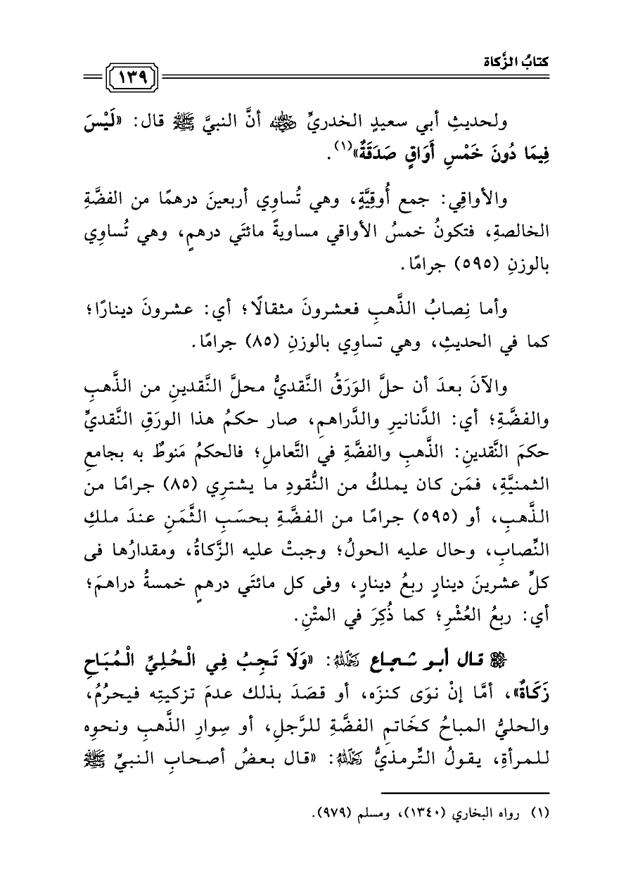 ولحديثِ أبي سعيدٍ الخدريِّ رضي الله عنه أنَّ النبيَّ صلى الله عليه وسلم قال: «لَيْسَ فِيمَا دُونَ خَمْسِ أَوَاقٍ صَدَقَةٌ» (¬١).