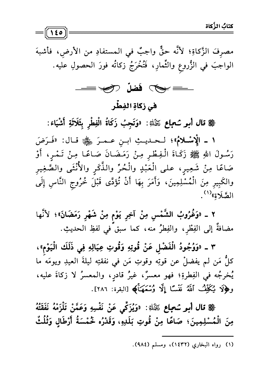 قال أبو شجاع رحمه الله: «وَتَجِبُ زَكَاةُ الْفِطْرِ بِثَلَاثَةِ أَشْيَاءَ: