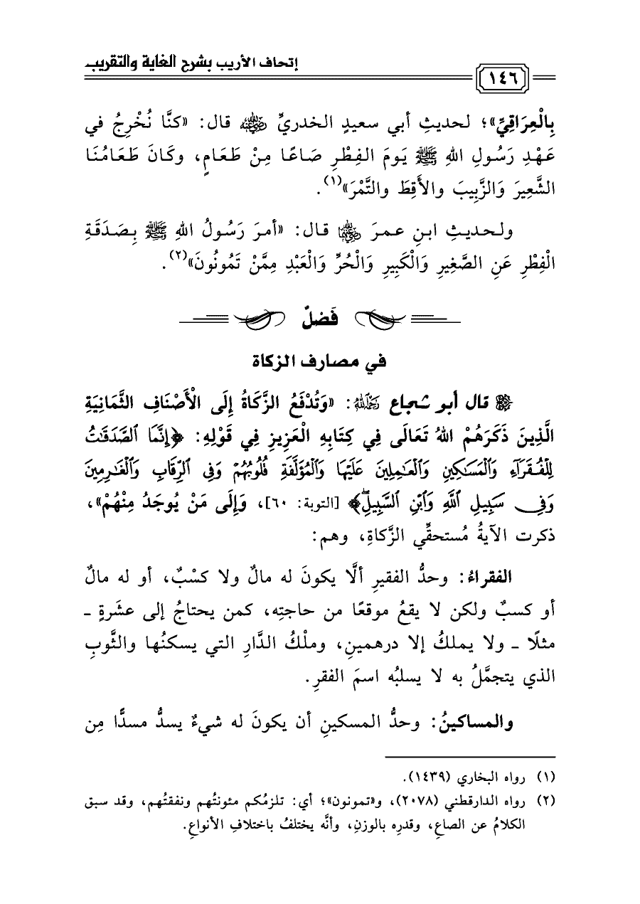بِالْعِرَاقِيِّ»؛ لحديثِ أبي سعيدٍ الخدريِّ رضي الله عنه قال: «كنَّا نُخْرِجُ في عَهْدِ رَسُولِ اللهِ صلى الله عليه وسلم يَومَ الفِطْرِ صَاعًا مِنْ طَعَامٍ، وكَانَ طَعَامُنَا الشَّعِيرَ وَالزَّبِيبَ والأَقِطَ والتَّمْرَ» (¬١).