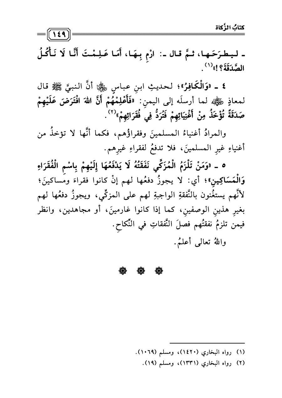 ٥ - «وَمَنْ تَلْزَمُ الْمُزَكِّي نَفَقَتُهُ لَا يَدْفَعُهَا إِلَيْهِمْ بِاسْمِ الْفُقَرَاءِ وَالْمَسَاكِينِ»؛ أي: لا يجوزُ دفعُها لهم إنْ كانوا فقراءَ ومساكينَ؛ لأنَّهم يستغُنون بالنَّفقةِ الواجبةِ لهم على المزكِّي، ويجوزُ دفعُها لهم بغيرِ هذينِ الوصفينِ، كما إذا كانوا غارمينَ، أو مجاهدين، وانظر فيمن تلزمُ نفقتُهم فصلَ النَّفقاتِ في النِّكاحِ.