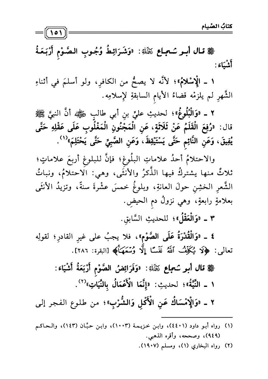 قال أبو شجاع رحمه الله: «وَشَرَائِطُ وُجُوبِ الصَّوْمِ أَرْبَعَةُ أَشْيَاءَ: