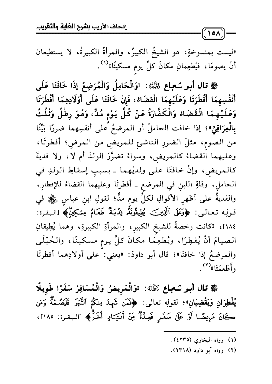 قال أبو شجاع رحمه الله: «وَالْحَامِلُ وَالْمُرْضِعُ إذَا خَافَتَا عَلَى أَنْفُسِهِمَا أَفْطَرَتَا وَعَلَيْهِمَا الْقضَاءُ، فَإِنْ خَافَتَا عَلَى أَوْلَادِهِمَا أَفْطَرَتَا وَعَلَيْهِمَا الْقَضَاءُ وَالْكَفَّارَةُ عَنْ كُلِّ يَوْمٍ مُدٌّ، وَهُوَ رِطْلٌ وَثُلُثٌ بِالْعِرَاقِيِّ»؛ إذا خافت الحاملُ أو المرضعُ على أنفسِهما ضررًا بَيِّنًا من الصومِ، مثلَ الضررِ الناشئِ للمريضِ من المرضِ؛ أفطرتَا، وعليهما القضاءُ كالمريضِ، وسواءٌ تضرَّرَ الولدُ أم لا، ولا فديةَ كالمريضِ، وإنْ خافتَا على ولديْهما -بسببِ إسقاطِ الولدِ في الحاملِ، وقلةِ اللبنِ في المرضعِ- أفطرتَا وعليهما القضاءُ للإفطارِ، والفديةُ على أظهرِ الأقوالِ لكلِّ يومٍ مدٌّ؛ لقولِ ابنِ عباسٍ رضي الله عنهما في قولِه تعالى: {وعلى الذين يطيقونه فدية طعام مسكين} [البقرة: ١٨٤]، «كانت رخصةً للشيخِ الكبيرِ، والمرأةِ الكبيرةِ، وهما يُطِيقانِ الصيامَ أنْ يُفطِرَا، ويُطعِمَا مكانَ كلِّ يومٍ مسكينًا، والحُبْلَى والمرضعُ إذا خافتَا»؛ قال أبو داودَ: «يعنِي على أولادِهما أفطرتَا وأَطْعمَتَا» (¬٢).