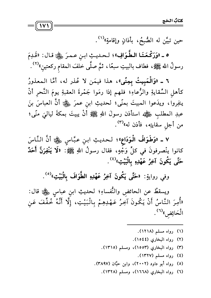 ٦ - «وَالْمَبِيتُ بِمِنًى»، هذا فيمَن لا عُذر له, أمَّا المعذورُ كأهلِ السِّقايةِ والرُّعاءِ؛ فلهم إذا رمَوا جَمْرةَ العقبةِ يومَ النَّحرِ أنْ ينفِروا، ويدَعوا المبيتَ بمنًى؛ لحديثِ ابنِ عمرَ رضي الله عنهما أنَّ العباسَ بنَ عبدِ المطلبِ رضي الله عنه استأذن رسولَ اللهِ صلى الله عليه وسلم أنْ يبيتَ بمكةَ لياليَ منًى؛ من أجلِ سقايتِه، فأذن له» (¬٣).
