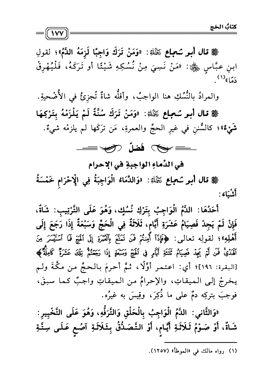 قال أبو شجاع رحمه الله: «وَمَنْ تَرَكَ وَاجِبًا لَزِمَهُ الدَّمُ»؛ لقولِ ابنِ عبَّاسٍ رضي الله عنهما: «مَنْ نَسِيَ مِنْ نُسُكِهِ شَيْئًا أو تَرَكَهُ، فَلْيُهْرِقْ دَمًا» (¬١).