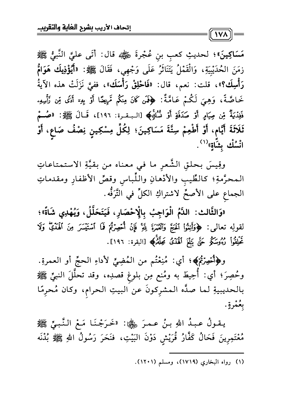 مَسَاكِينَ»؛ لحديثِ كعبِ بنِ عُجْرةَ رضي الله عنه قال: أتَى عليَّ النَّبيُّ صلى الله عليه وسلم زمَنَ الحُدَيْبِيَةِ، وَالْقَمْلُ يَتَنَاثَرُ عَلَى وَجْهِي، فَقَالَ صلى الله عليه وسلم: «أَيُؤْذِيكَ هَوَامُّ رَأْسِكَ؟»، قلت: نعم، قال: «فَاحْلِقْ رَأْسَكَ»، ففيَّ نَزَلَتْ هذه الآيةُ خَاصَّةً، وَهِيَ لَكُمْ عَامَّةٌ: {فَمَنْ كَانَ مِنْكُمْ مَرِيضًا أَوْ بِهِ أَذًى مِنْ رَأْسِهِ فَفِدْيَةٌ مِنْ صِيَامٍ أَوْ صَدَقَةٍ أَوْ نُسُكٍ} [البقرة: ١٩٦]، قَالَ صلى الله عليه وسلم: «صُمْ ثَلَاثَةَ أَيَّامٍ، أَوْ أَطْعِمْ سِتَّةَ مَسَاكِينَ؛ لِكُلِّ مِسْكِينٍ نِصْفُ صَاعٍ، أَوْ انْسُكْ بِشَاةٍ» (¬١).