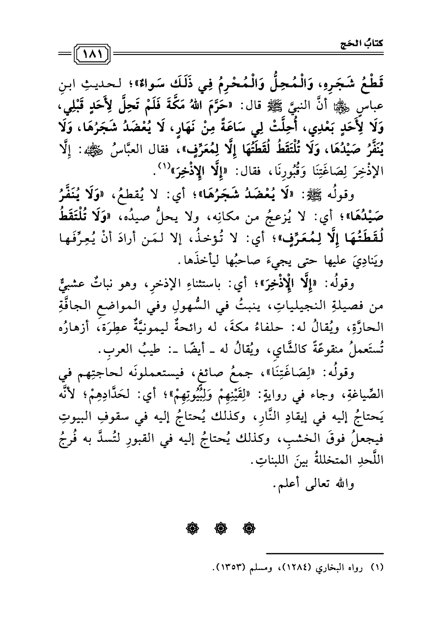 قَطْعُ شَجَرِهِ، وَالْمُحِلُّ وَالْمُحْرِمُ فِي ذَلَكَ سَواءٌ»؛ لحديثِ ابنِ عباسٍ رضي الله عنهما أنَّ النبيَّ صلى الله عليه وسلم قال: «حَرَّمَ اللهُ مَكَّةَ فَلَمْ تَحِلَّ لِأَحَدٍ قَبْلِي، وَلَا لِأَحَدٍ بَعْدِي، أُحِلَّتْ لِي سَاعَةً مِنْ نَهَارٍ، لَا يُعْضَدُ شَجَرُهَا، وَلَا يُنَفَّرُ صَيْدُهَا، وَلَا تُلْتَقَطُ لُقَطَتُهَا إِلَّا لِمُعَرِّفٍ»، فقال العبَّاسُ رضي الله عنه: إِلَّا الإذْخِرَ لِصَاغَتِنَا وَقُبُورِنَا، فقال: «إِلَّا الإِذْخِرَ» (¬١).