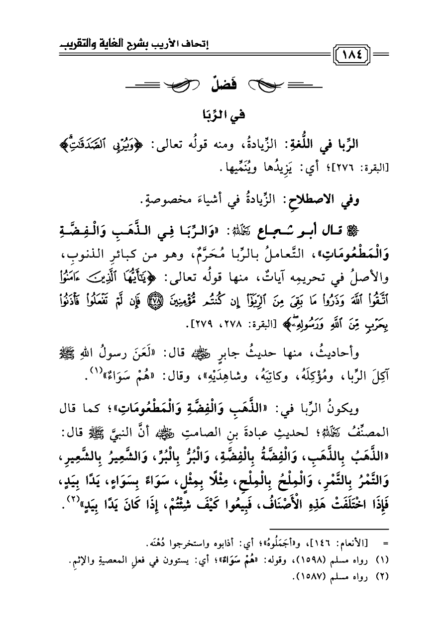 قال أبو شجاع رحمه الله: «وَالرِّبَا فِي الذَّهَبِ وَالْفِضَّةِ وَالْمَطْعُومَاتِ»، التَّعاملُ بالرِّبا مُحَرَّمٌ، وهو من كبائرِ الذنوبِ، والأصلُ في تحريمِه آياتٌ، منها قولُه تعالى: {يَا أَيُّهَا الَّذِينَ آمَنُوا اتَّقُوا اللهَ وَذَرُوا مَا بَقِيَ مِنَ الرِّبَا إِنْ كُنْتُمْ مُؤْمِنِينَ (٢٧٨) فَإِنْ لَمْ تَفْعَلُوا فَأْذَنُوا بِحَرْبٍ مِنَ اللهِ وَرَسُولِهِ} [البقرة: ٢٧٨، ٢٧٩].