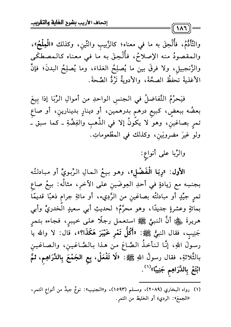 فيَحرُمُ التَّفاضلُ في الجنسِ الواحدِ من أموالِ الرِّبَا إذا بِيعَ بعضُه ببعضٍ، كبيعِ درهمٍ بدرهمين، أو دينارٍ بدينارينِ، أو صاعِ تمرٍ بصاعَينِ، وهو لا يكونُ إلا في الذَّهبِ والفِضَّةِ -كما سبق- ولو غيرَ مضروبَينِ، وكذلك في المطْعوماتِ.
