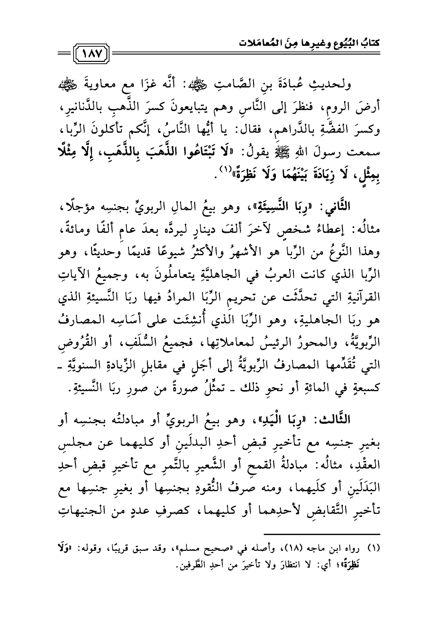 ولحديثِ عُبادَةَ بنِ الصَّامتِ رضي الله عنه: أنَّه غزَا مع معاويةَ رضي الله عنه أرضَ الرومِ، فنظرَ إلى النَّاسِ وهم يتبايعونَ كسرَ الذَّهبِ بالدَّنانيرِ، وكسرَ الفضَّةِ بالدَّراهمِ، فقال: يا أيُّها النَّاسُ، إنَّكم تأكلونَ الرِّبا، سمعت رسولَ اللهِ صلى الله عليه وسلم يقولُ: «لَا تَبْتَاعُوا الذَّهَبَ بِالذَّهَبِ، إِلَّا مِثْلًا بِمِثْلٍ، لَا زِيَادَةَ بَيْنَهُمَا وَلَا نَظِرَةً» (¬١).