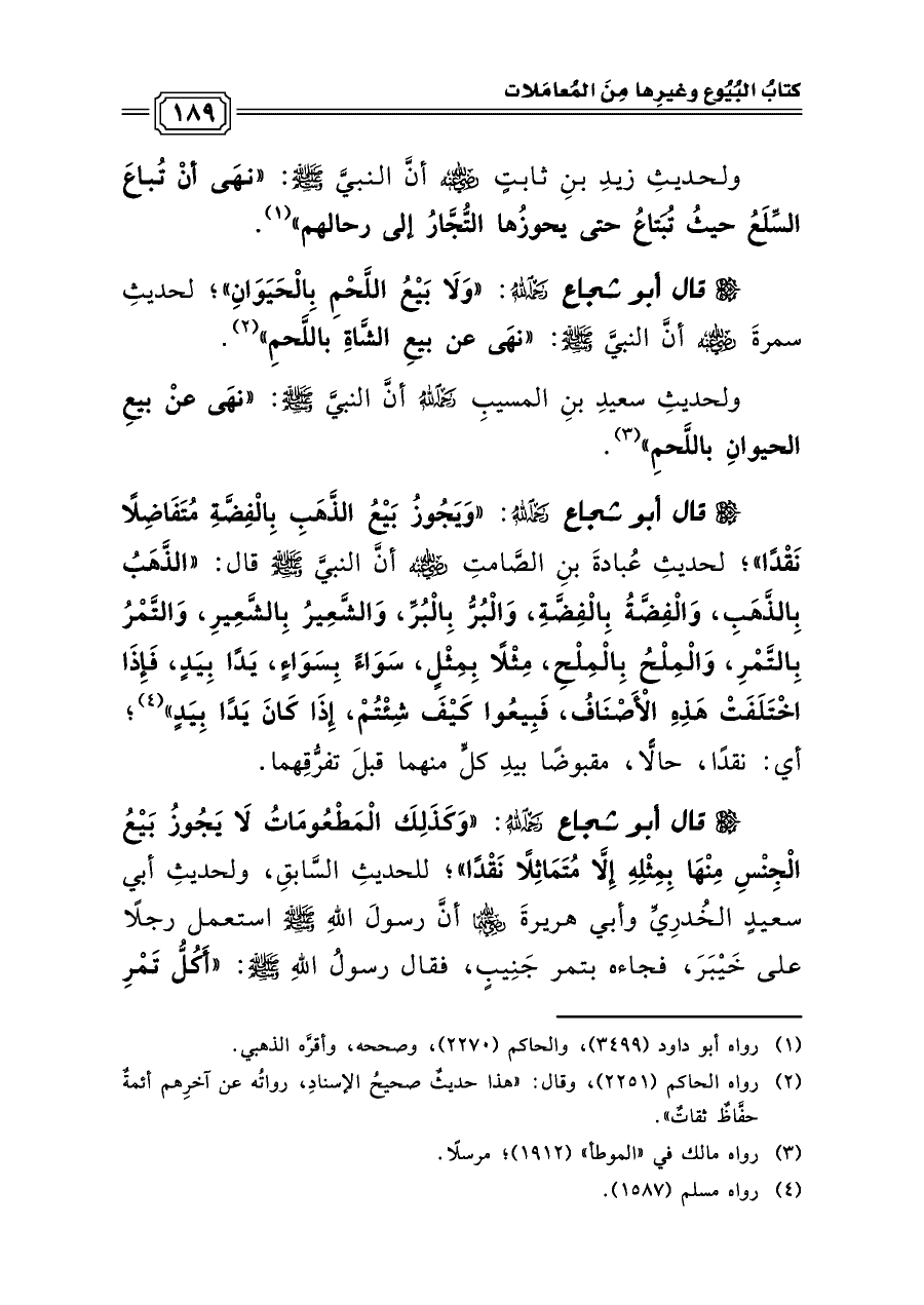 قال أبو شجاع رحمه الله: «وَكَذَلِكَ الْمَطْعُومَاتُ لَا يَجُوزُ بَيْعُ الْجِنْسِ مِنْهَا بِمِثْلِهِ إِلَّا مُتَمَاثِلًا نَقْدًا»؛ للحديثِ السَّابقِ، ولحديثِ أبي سعيدٍ الخُدرِيِّ وأبي هريرةَ رضي الله عنهما أنَّ رسولَ اللهِ صلى الله عليه وسلم استعمل رجلًا على خَيْبَرَ، فجاءه بتمر جَنِيبٍ، فقال رسولُ اللهِ صلى الله عليه وسلم: «أَكُلُّ تَمْرِ
