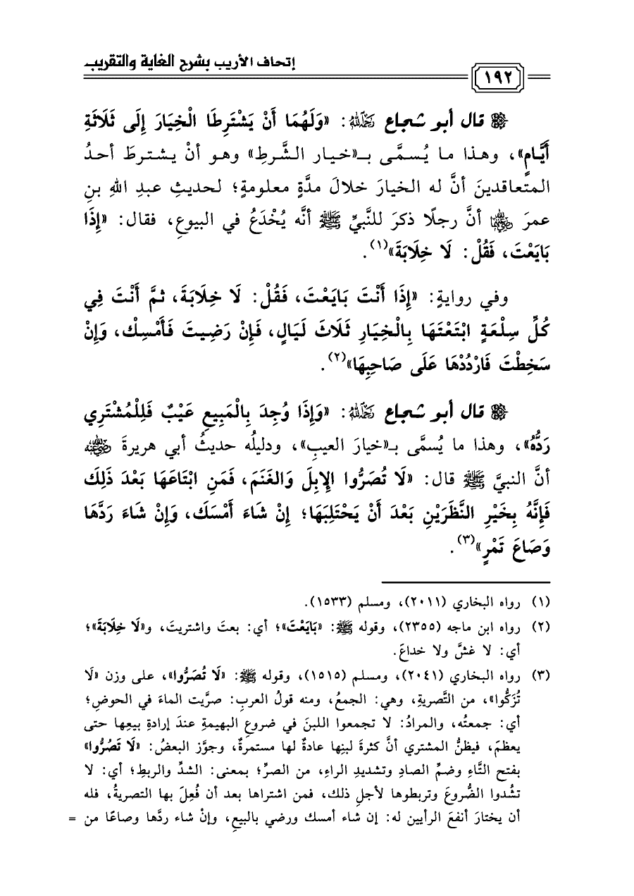 قال أبو شجاع رحمه الله: «وَإِذَا وُجِدَ بِالْمَبِيعِ عَيْبٌ فَلِلْمُشْتَرِي رَدُّهُ»، وهذا ما يُسمَّى بـ «خيارَ العيبِ»، ودليلُه حديثُ أبي هريرةَ رضي الله عنه أنَّ النبيَّ صلى الله عليه وسلم قال: «لَا تُصَرُّوا الإِبِلَ وَالغَنَمَ، فَمَنِ ابْتَاعَهَا بَعْدَ ذَلِكَ فَإِنَّهُ بِخَيْرِ النَّظَرَيْنِ بَعْدَ أَنْ يَحْتَلِبَهَا؛ إِنْ شَاءَ أَمْسَكَ، وَإِنْ شَاءَ رَدَّهَا وَصَاعَ تَمْرٍ» (¬٣).