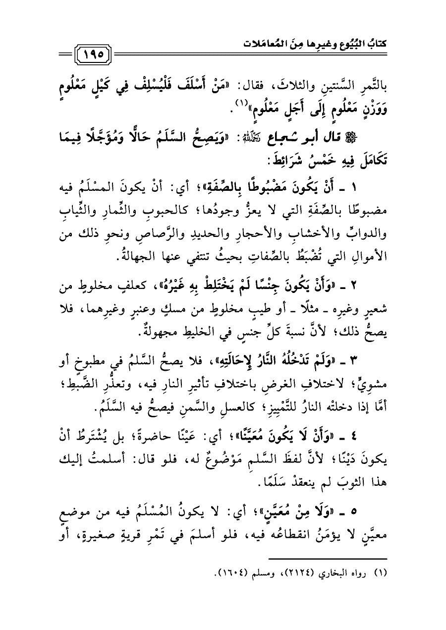 قال أبو شجاع رحمه الله: «وَيَصِحُّ السَّلَمُ حَالًّا وَمُؤَجَّلًا فِيمَا تَكَامَلَ فِيهِ خَمْسُ شَرَائِطَ: