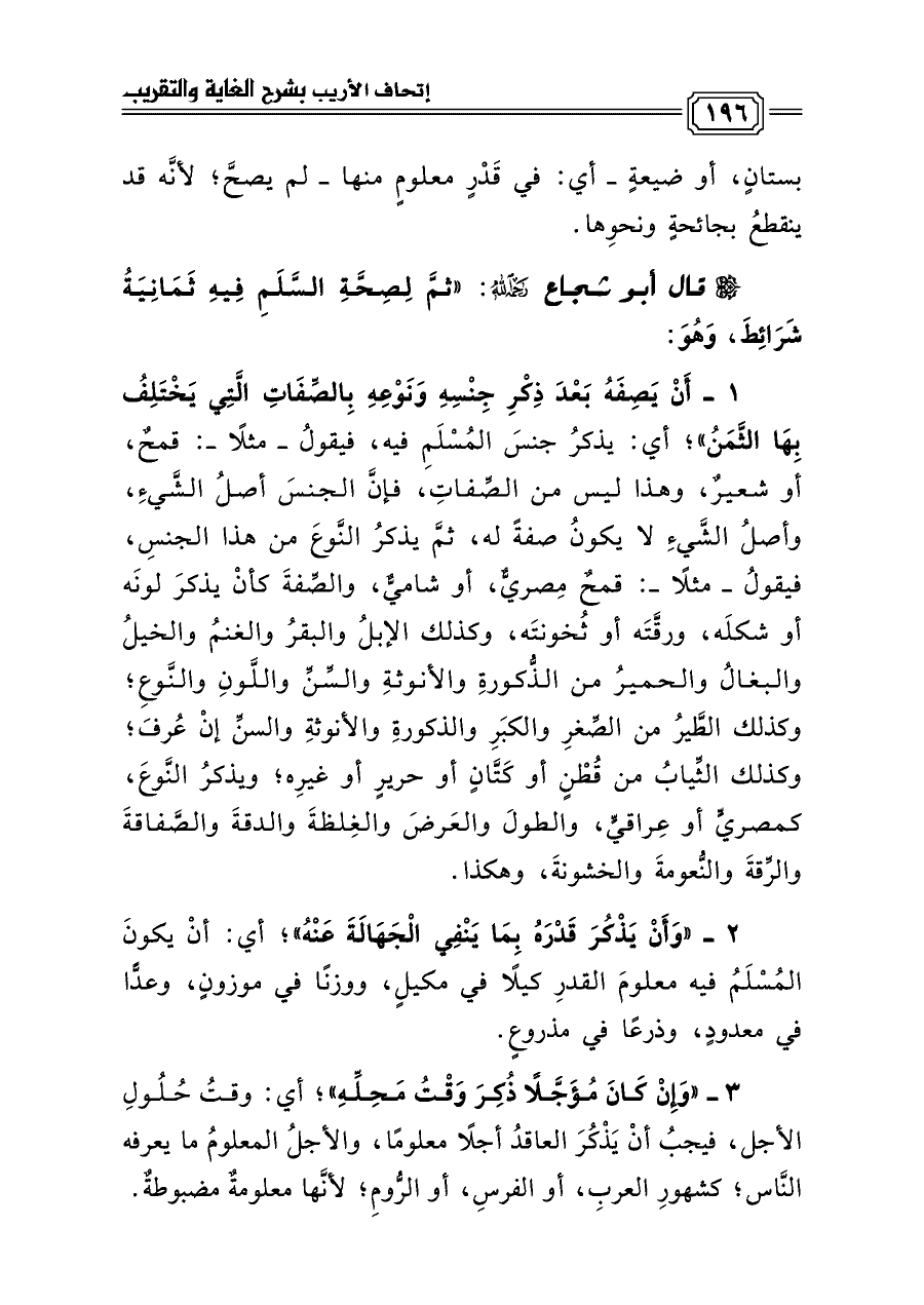 قال أبو شجاع رحمه الله: «ثمَّ لِصِحَّةِ السَّلَمِ فِيهِ ثَمَانِيَةُ شَرَائِطَ، وَهُوَ: