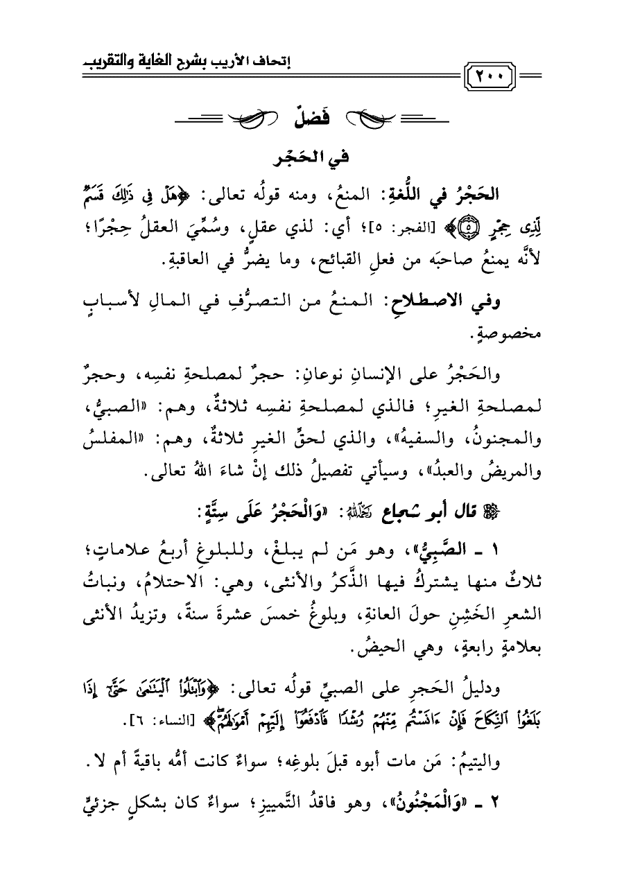 قال أبو شجاع رحمه الله: «وَالْحَجْرُ عَلَى سِتَّةٍ:
