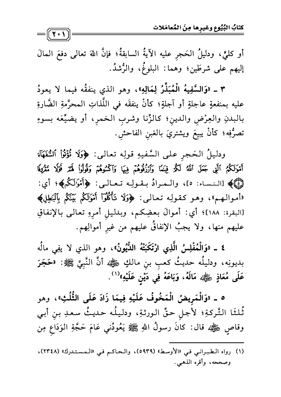 ودليلُ الحَجرِ على السَّفيهِ قولِه تعالى: {وَلَا تُؤْتُوا السُّفَهَاء أَمْوَالَكُمُ الَّتِي جَعَلَ اللّهُ لَكُمْ قِيَامًا وَارْزُقُوهُمْ فِيهَا وَاكْسُوهُمْ وَقُولُوا لَهُمْ قَوْلاً مَّعْرُوفًا} [النساء: ٥]، والمرادُ بقولِه تعالى: {أَمْوَالَكُمُ}؛ أي: «أموالهم»، وهو كقولِه تعالى: {وَلا تَأْكُلُوا أَمْوَالَكُمْ بَيْنَكُمْ بِالْبَاطِلِ} [البقرة: ١٨٨]؛ أي: أموالَ بعضِكم، وبدليلِ أمرِهِ تعالى بالإنفاقِ عليهم منها، ولا يجبُ الإنفاقُ عليهم من غيرِ أموالِهم.