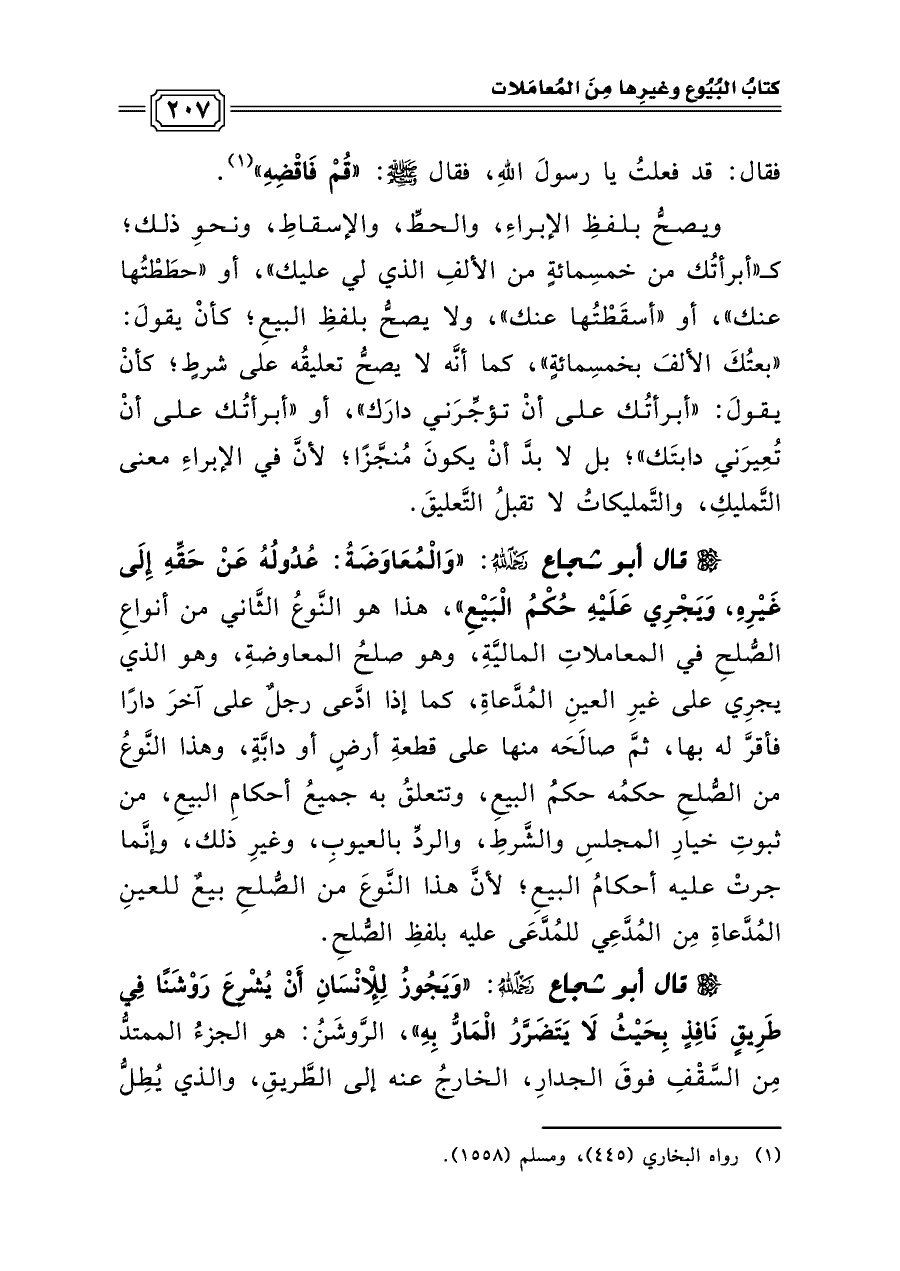 قال أبو شجاع رحمه الله: «وَالْمُعَاوَضَةُ: عُدُولُهُ عَنْ حَقِّهِ إِلَى غَيْرِهِ، وَيَجْرِي عَلَيْهِ حُكْمُ الْبَيْعِ»، هذا هو النَّوعُ الثَّاني من أنواعِ الصُّلحِ في المعاملاتِ الماليَّةِ، وهو صلحُ المعاوضةِ، وهو الذي يجرِي على غيرِ العينِ المُدَّعاةِ، كما إذا ادَّعى رجلٌ على آخرَ دارًا فأقرَّ له بها، ثمَّ صالَحَه منها على قطعةِ أرضٍ أو دابَّةٍ، وهذا النَّوعُ من الصُّلحِ حكمُه حكمُ البيعِ، وتتعلقُ به جميعُ أحكامِ البيعِ، من ثبوتِ خيارِ المجلسِ والشَّرطِ، والردِّ بالعيوبِ، وغيرِ ذلك، وإنَّما جرتْ عليه أحكامُ البيعِ؛ لأنَّ هذا النَّوعَ من الصُّلحِ بيعٌ للعينِ المُدَّعاةِ مِن المُدَّعِي للمُدَّعَى عليه بلفظِ الصُّلحِ.