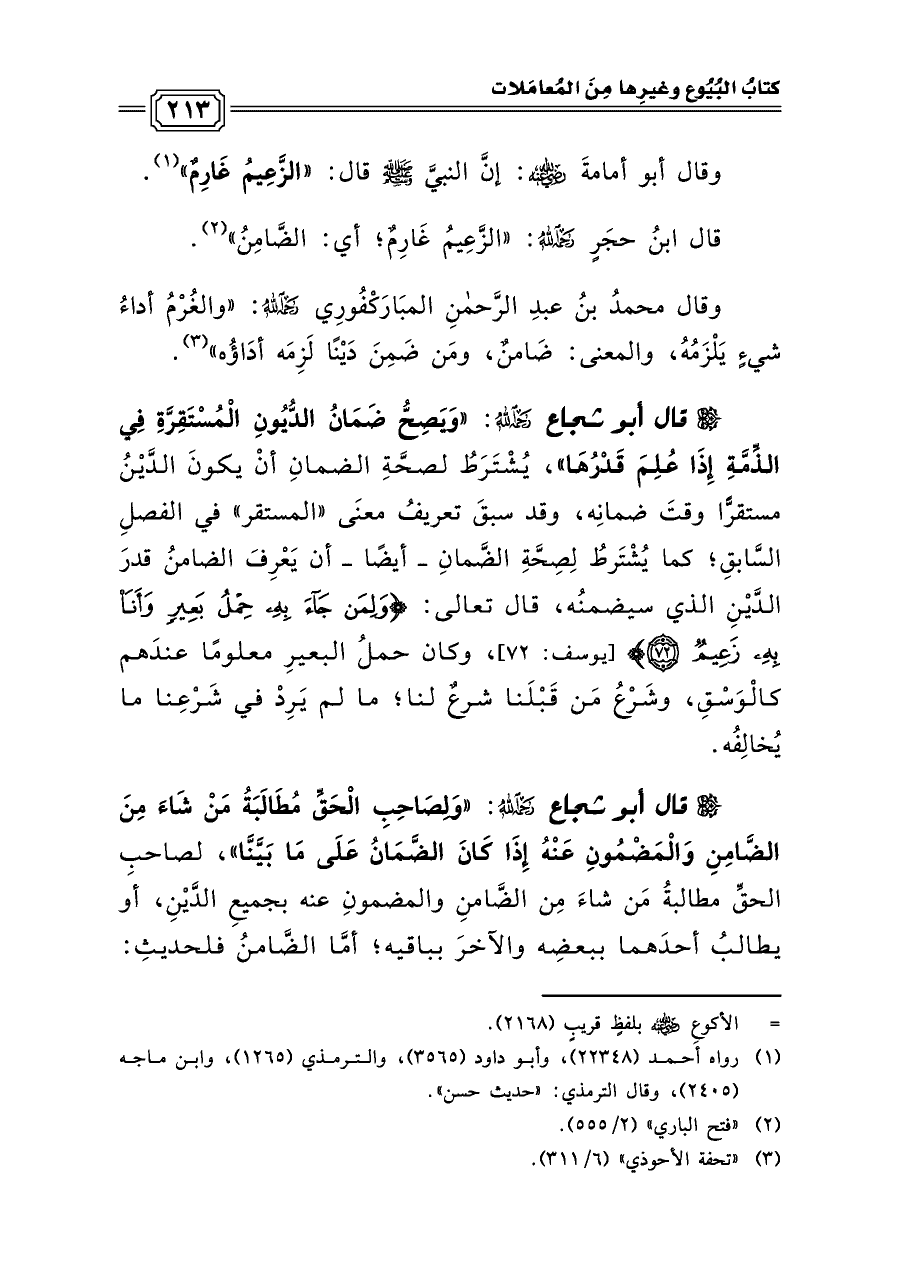 وقال أبو أمامةَ رضي الله عنه: إنَّ النبيَّ صلى الله عليه وسلم قال: «الزَّعِيمُ غَارِمٌ» (¬١).