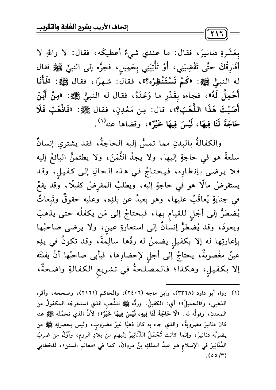 (¬١) رواه أبو داود (٣٣٢٨)، وابن ماجه (٢٤٠٦)، والحاكم (٢١٦١)، وصححه، وأقره الذهبي، و «الحميلُ»؛ أي: الكفيلُ. وردُّه صلى الله عليه وسلم للذَّهبِ الذي استخرجَه المكفولُ من المعدنِ، وقولُه له: «لَا حَاجَةَ لَنَا فِيهِ، لَيْسَ فِيهَا خَيْرٌ»؛ لأنَّ الذي تحمَّله صلى الله عليه وسلم عنه كان دنانيرَ مضروبةً، والذي جاء به كان ذهبًا غيرَ مضروبٍ، وليس بحضرتِه صلى الله عليه وسلم من يضربُه دنانيرَ، وإنما كانت تُحْمَلُ الدَّنَانِيرُ إليهم من بلادِ الرومِ، وأوَّلُ من ضربَ الدَّنَانِيرَ في الإسلامِ هو عبدُ الملكِ بنُ مروانَ، كما في «معالم السنن» للخطابي (٣/ ٥٥).
