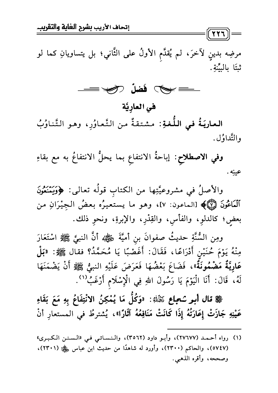 قال أبو شجاع رحمه الله: «وَكُلُّ مَا يُمْكِنُ الانْتِفَاعُ بِهِ مَعَ بَقَاءِ عَيْنِهِ جَازَتْ إِعَارَتُهُ إِذَا كَانَتْ مَنَافِعُهُ آثَارًا»، يُشترطُ في المستعارِ أنْ