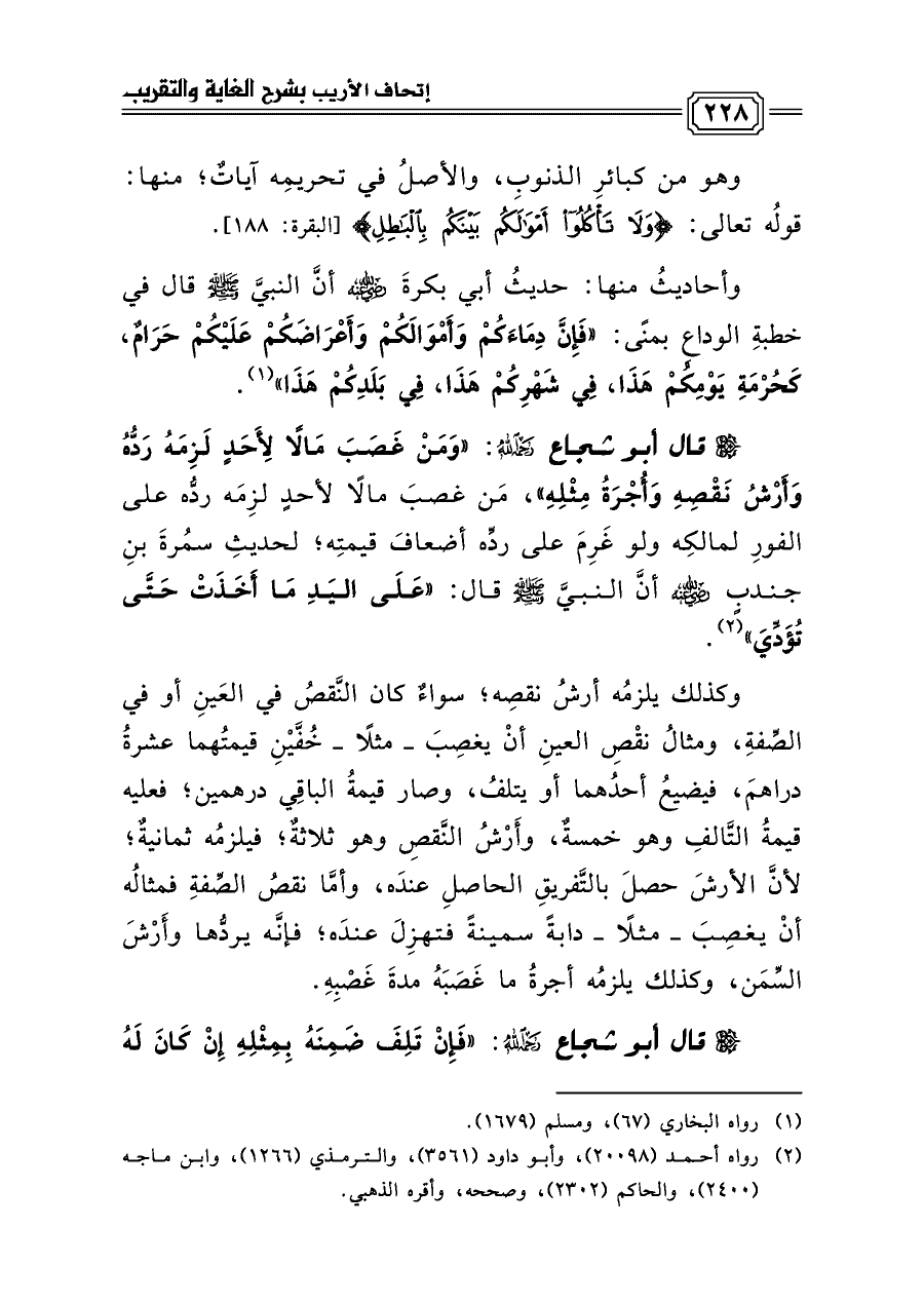 قال أبو شجاع رحمه الله: «وَمَنْ غَصَبَ مَالًا لِأَحَدٍ لَزِمَهُ رَدُّهُ وَأَرْشُ نَقْصِهِ وَأُجْرَةُ مِثْلِهِ»، مَن غصبَ مالًا لأحدٍ لزِمَه ردُّه على الفورِ لمالكِه ولو غَرِمَ على ردِّه أضعافَ قيمتِه؛ لحديثِ سمُرةَ بنِ جندبٍ رضي الله عنه أنَّ النبيَّ صلى الله عليه وسلم قال: «عَلَى اليَدِ مَا أَخَذَتْ حَتَّى تُؤَدِّيَ» (¬٢).