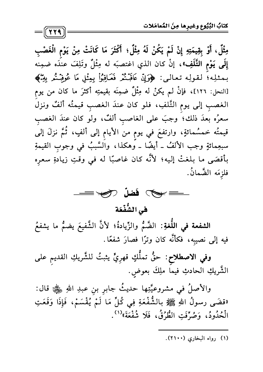 مِثْلٌ، أَوْ بِقِيمَتِهِ إِنْ لَمْ يَكُنْ لَهُ مِثْلٌ؛ أَكْثَرَ مَا كَانَتْ مِنْ يَوْمِ الْغَصْبِ إِلَى يَوْمِ التَّلَفِ»، إنْ كان الذي اغتصبَه له مِثْلٌ وتَلِفَ عندَه ضمِنه بمثلِه؛ لقولِه تعالى: {وَإِنْ عَاقَبْتُمْ فَعَاقِبُوا بِمِثْلِ مَا عُوقِبْتُم بِهِ} [النحل: ١٢٦]، فإنْ لم يكنْ له مِثْلٌ ضمِنَه بقيمتِه أكثرَ ما كان من يومِ الغصبِ إلى يومِ التَّلفِ، فلو كان عندَ الغصبِ قيمتُه ألفٌ ونزل سعرُه بعدَ ذلك؛ وجبَ على الغاصبِ ألفٌ، ولو كان عندَ الغصبِ قيمتُه خمسُمائةٍ، وارتفعَ في يومٍ من الأيامِ إلى ألفٍ، ثُمَّ نزلَ إلى سبعِمائةٍ وجب الألفُ -أيضًا- وهكذا، والسَّببُ في وجوبِ القيمةِ بأقصَى ما بلغتْ إليه؛ لأنَّه كان غاصبًا له في وقتِ زيادةِ سعرِه فلزِمَه الضَّمانُ.