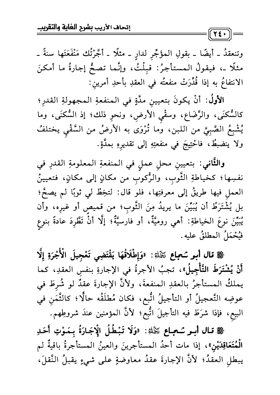 قال أبو شجاع رحمه الله: «وَإِطْلَاقُهَا يَقْتَضِي تَعْجِيلَ الْأُجْرَةِ إِلَّا أَنْ يُشْتَرَطَ التَّأْجِيلُ»، تجبُ الأجرةُ في الإجارةِ بنفسِ العقدِ، كما يملكُ المستأجرُ بالعقدِ المنفعةَ، ولأنَّ الإجارةَ عقدٌ لو شُرِطَ في عوضِه التَّعجيلُ أو التأجيلُ اتُّبع، فكان مُطلَقُه حالًّا؛ كالثَّمَنِ في البيعِ، فإذا شرَطَ فيه التأجيلَ اتُّبِع؛ لأنَّ المؤمنين عندَ شروطِهم.