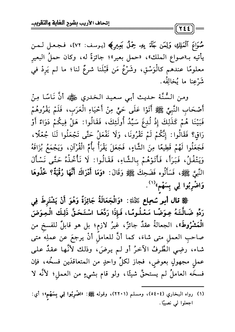 صُوَاعَ الْمَلِكِ وَلِمَنْ جَاءَ بِهِ حِمْلُ بَعِيرٍ} [يوسف: ٧٢]، فجعل لمن يأتيه بـ «صواع الملك»، «حمل بعير»؛ جائزةً له، وكان حملُ البعيرِ معلومًا عندهم كالْوَسْقِ، وشَرْعُ مَن قَبْلَنا شرعٌ لنا؛ ما لم يَرِدْ في شَرْعِنا ما يُخالِفُه.