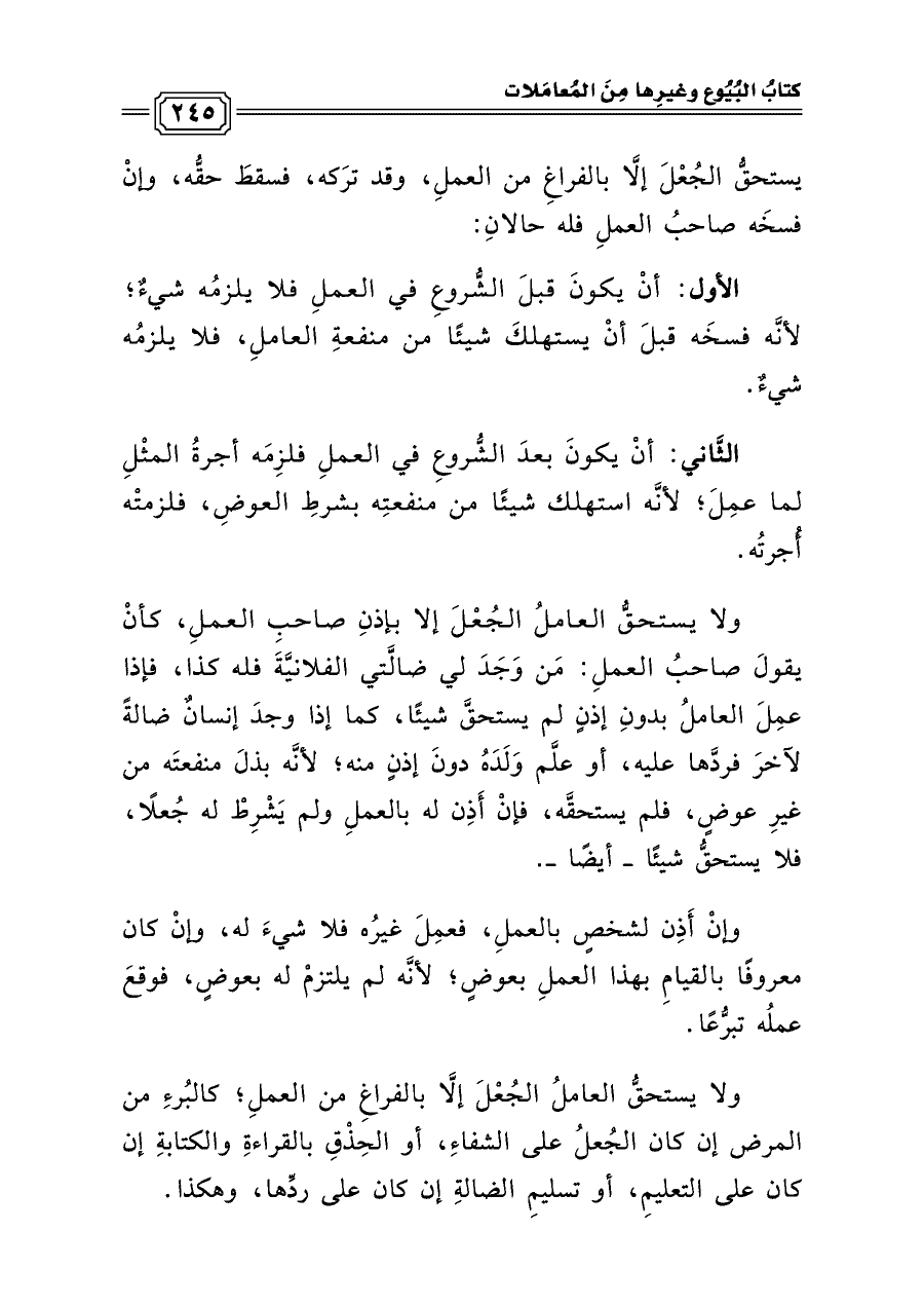 ولا يستحقُّ العاملُ الجُعْلَ إلا بإذنِ صاحبِ العملِ، كأنْ يقولَ صاحبُ العملِ: مَن وَجَدَ لي ضالَّتي الفلانيَّةَ فله كذا، فإذا عمِلَ العاملُ بدونِ إذنٍ لم يستحقَّ شيئًا، كما إذا وجدَ إنسانٌ ضالةً لآخرَ فردَّها عليه، أو علَّم وَلَدَهُ دونَ إذنٍ منه؛ لأنَّه بذلَ منفعتَه من غيرِ عوضٍ، فلم يستحقَّه، فإنْ أَذِن له بالعملِ ولم يَشْرِطْ له جُعلًا، فلا يستحقُّ شيئًا -أيضًا-.