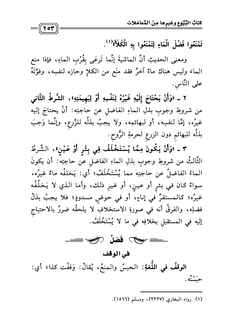 ٢ - «وَأَنْ يَحْتَاجَ إِلَيْهِ غَيْرُهُ لِنَفْسِهِ أَوْ لِبَهِيمَتِهِ»، الشَّرطُ الثَّاني من شروطِ وجوبِ بذلِ الماءِ الفاضلِ عن حاجتِه: أنْ يحتاجَ إليه غيرُه، إمَّا لنفسِه، أو لبهائمِه، ولا يجبُ بذلُه للزَّرعِ، وإنَّما وَجبَ بذلُه للبهائمِ دون الزرعِ لحرمةِ الرُّوحِ.