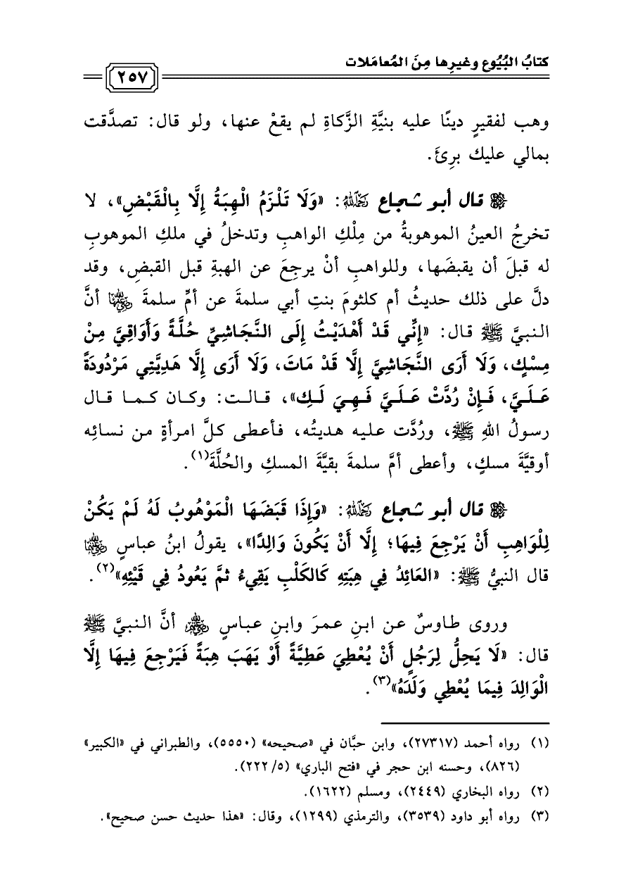 قال أبو شجاع رحمه الله: «وَلَا تَلْزَمُ الْهِبَةُ إِلَّا بِالْقَبْضِ»، لا تخرجُ العينُ الموهوبةُ من مِلْكِ الواهبِ وتدخلُ في ملكِ الموهوبِ له قبلَ أن يقبضَها، وللواهبِ أنْ يرجِعَ عن الهبةِ قبل القبضِ، وقد دلَّ على ذلك حديثُ أم كلثومَ بنتِ أبي سلمةَ عن أمِّ سلمةَ رضي الله عنها أنَّ النبيَّ صلى الله عليه وسلم قال: «إِنِّي قَدْ أَهْدَيْتُ إِلَى النَّجَاشِيِّ حُلَّةً وَأَوَاقِيَّ مِنْ مِسْكٍ، وَلَا أَرَى النَّجَاشِيَّ إِلَّا قَدْ مَاتَ، وَلَا أَرَى إِلَّا هَدِيَّتِي مَرْدُودَةً عَلَيَّ، فَإِنْ رُدَّتْ عَلَيَّ فَهِيَ لَكِ»، قالت: وكان كما قال رسولُ اللهِ صلى الله عليه وسلم، ورُدَّت عليه هديتُه، فأعطى كلَّ امرأةٍ من نسائِه أوقيَّةَ مسكٍ، وأعطى أمَّ سلمةَ بقيَّةَ المسكِ والحُلَّةَ (¬١).