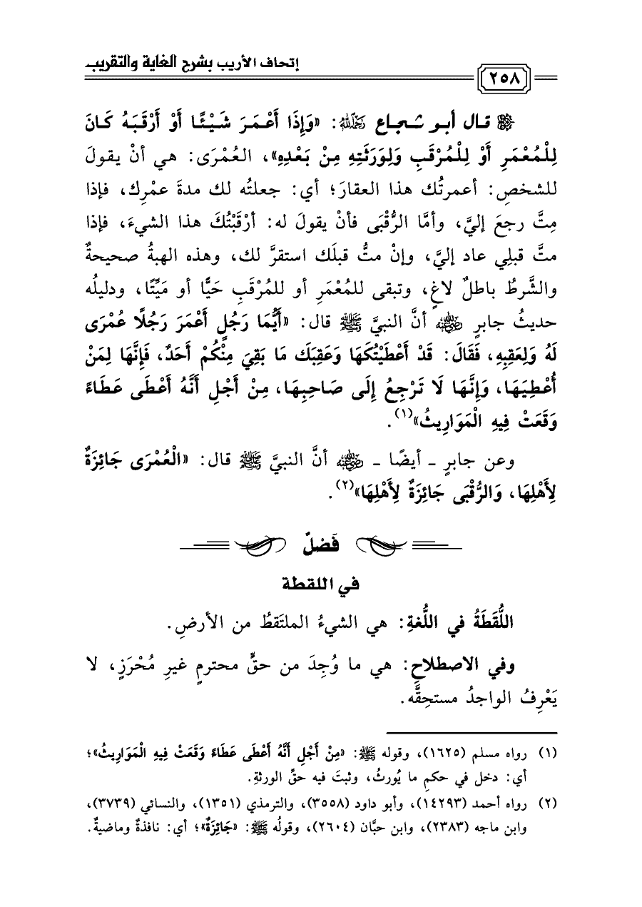 قال أبو شجاع رحمه الله: «وَإِذَا أَعْمَرَ شَيْئًا أَوْ أَرْقَبَهُ كَانَ لِلْمُعْمَرِ أَوْ لِلْمُرْقَبِ وَلِوَرَثَتِهِ مِنْ بَعْدِهِ»، العُمْرَى: هي أنْ يقولَ للشخصِ: أعمرتُك هذا العقارَ؛ أي: جعلتُه لك مدةَ عمْرِك، فإذا مِتَّ رجعَ إليَّ، وأمَّا الرُّقْبَى فأنْ يقولَ له: أرْقَبْتُكَ هذا الشيءَ، فإذا متَّ قبلِي عاد إليَّ، وإنْ متُّ قبلَك استقرَّ لك، وهذه الهبةُ صحيحةٌ والشَّرطُ باطلٌ لاغٍ، وتبقى للمُعْمَرِ أو للمُرْقَبِ حَيًّا أو مَيِّتًا، ودليلُه حديثُ جابرٍ رضي الله عنه أنَّ النبيَّ صلى الله عليه وسلم قال: «أَيُّمَا رَجُلٍ أَعْمَرَ رَجُلًا عُمْرَى لَهُ وَلِعَقِبِهِ، فَقَالَ: قَدْ أَعْطَيْتُكَهَا وَعَقِبَكَ مَا بَقِيَ مِنْكُمْ أَحَدٌ، فَإِنَّهَا لِمَنْ أُعْطِيَهَا، وَإِنَّهَا لَا تَرْجِعُ إِلَى صَاحِبِهَا، مِنْ أَجْلِ أَنَّهُ أَعْطَى عَطَاءً وَقَعَتْ فِيهِ الْمَوَارِيثُ» (¬١).