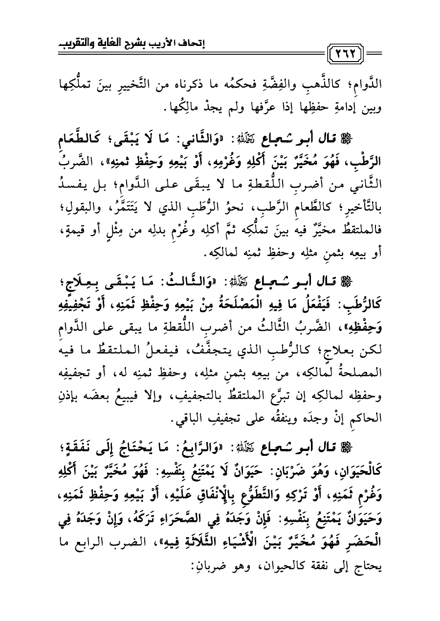 قال أبو شجاع رحمه الله: «وَالرَّابِعُ: مَا يَحْتَاجُ إِلَى نَفَقَةٍ، كَالْحَيَوَانِ، وَهُوَ ضَرْبَانِ: حَيَوَانٌ لَا يَمْتَنِعُ بِنَفْسِهِ: فَهُوَ مُخَيَّرٌ بَيْنَ أَكْلِهِ وَغُرْمِ ثَمَنِهِ، أَوْ تَرْكِهِ وَالتَّطَوُّعِ بِالْإِنْفَاقِ عَلَيْهِ، أَوْ بَيْعِهِ وَحِفْظِ ثَمَنِهِ، وَحَيَوَانٌ يَمْتَنِعُ بِنَفْسِهِ: فَإِنْ وَجَدَهُ فِي الصَّحَرَاءِ تَرَكَهُ، وَإِنْ وَجَدَهُ فِي الْحَضَرِ فَهُوَ مُخَيَّرٌ بَيْنَ الْأَشْيَاءِ الثَّلَاثَةِ فِيهِ»، الضرب الرابع ما يحتاج إلى نفقة كالحيوان، وهو ضربانِ: