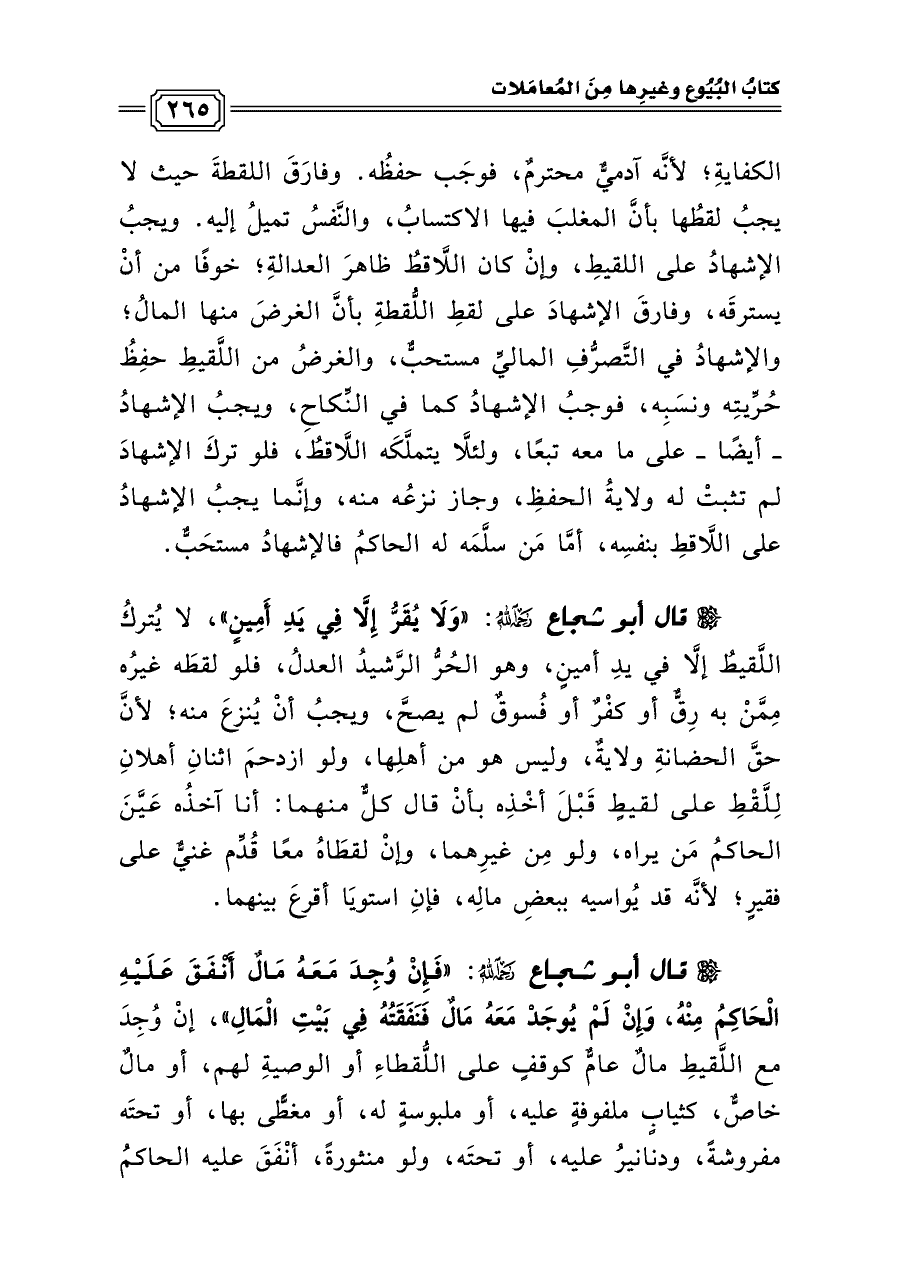 الكفايةِ؛ لأنَّه آدميٌّ محترمٌ، فوجَب حفظُه. وفارَقَ اللقطةَ حيث لا يجبُ لقطُها بأنَّ المغلبَ فيها الاكتسابُ، والنَّفسُ تميلُ إليه. ويجبُ الإشهادُ على اللقيطِ، وإنْ كان اللَّاقطُ ظاهرَ العدالةِ؛ خوفًا من أنْ يسترقَه، وفارقَ الإشهادَ على لقطِ اللُّقطةِ بأنَّ الغرضَ منها المالُ؛ والإشهادُ في التَّصرُّفِ الماليِّ مستحبٌّ، والغرضُ من اللَّقيطِ حفِظُ حُرِّيتِه ونسَبِه، فوجبُ الإشهادُ كما في النِّكاحِ، ويجبُ الإشهادُ -أيضًا- على ما معه تبعًا، ولئلَّا يتملَّكَه اللَّاقطُ، فلو تركَ الإشهادَ لم تثبتْ له ولايةُ الحفظِ، وجاز نزعُه منه، وإنَّما يجبُ الإشهادُ على اللَّاقطِ بنفسِه، أمَّا مَن سلَّمَه له الحاكمُ فالإشهادُ مستحَبٌّ.