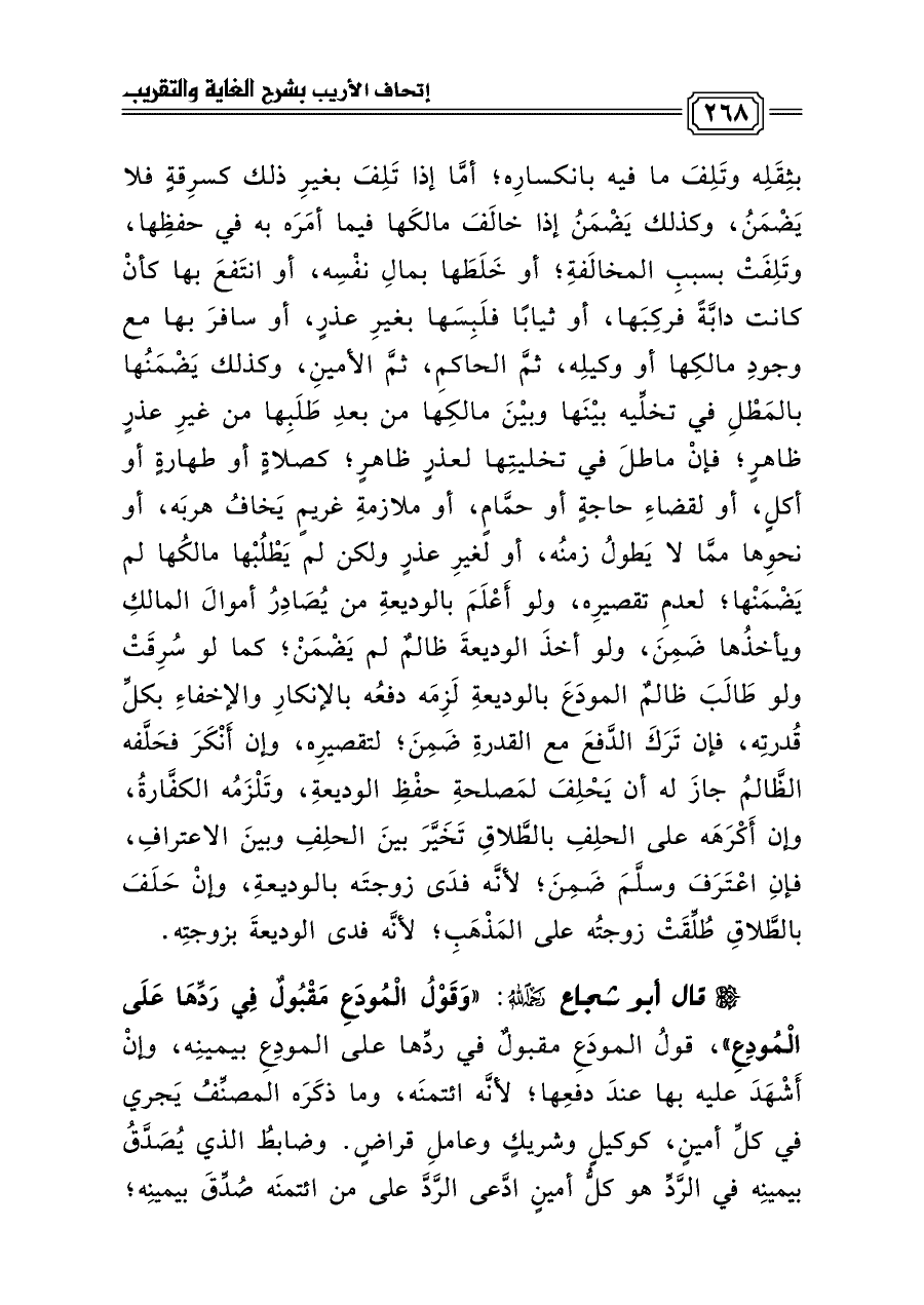 قال أبو شجاع رحمه الله: «وَقَوْلُ الْمُودَعِ مَقْبُولٌ فِي رَدِّهَا عَلَى الْمُودِعِ»، قولُ المودَعِ مقبولٌ في ردِّها على المودِعِ بيمينِه، وإنْ أَشْهَدَ عليه بها عندَ دفعِها؛ لأنَّه ائتمنَه، وما ذكَرَه المصنِّفُ يَجري في كلِّ أمينٍ، كوكيلٍ وشريكٍ وعاملِ قراضٍ. وضابطُ الذي يُصَدَّقُ بيمينِه في الرَّدِّ هو كلُّ أمينٍ ادَّعى الرَّدَّ على من ائتمنَه صُدِّقَ بيمينِه؛