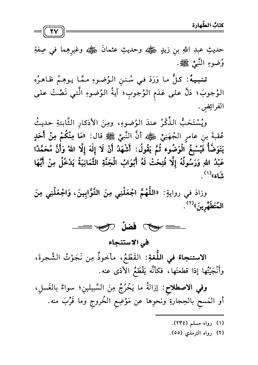 حديثِ عبدِ اللهِ بنِ زيدٍ رضي الله عنه وحديثِ عثمانَ رضي الله عنه وغيرِهِما في صِفةِ وُضوءِ النَّبيِّ صلى الله عليه وسلم.
