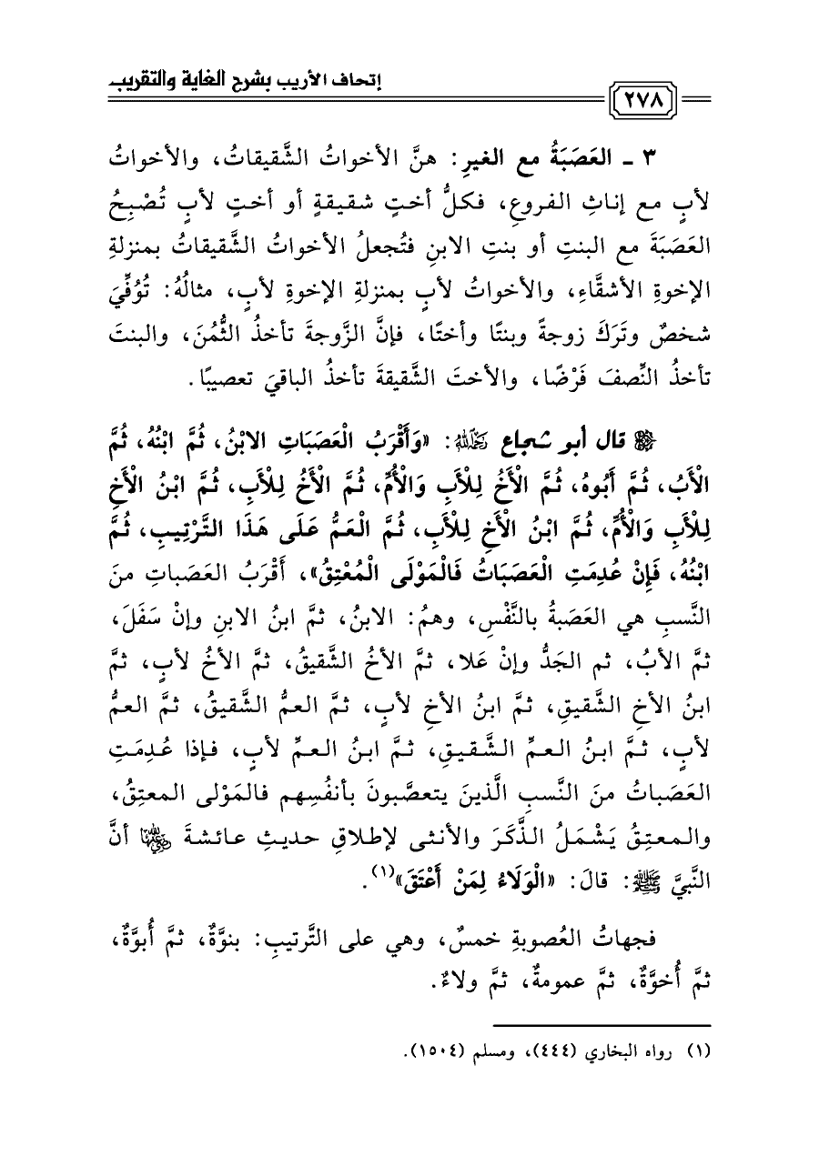 قال أبو شجاع رحمه الله: «وَأَقْرَبُ الْعَصَبَاتِ الابْنُ، ثُمَّ ابْنُهُ، ثُمَّ الْأَبُ، ثُمَّ أَبُوهُ، ثُمَّ الْأَخُ لِلْأَبِ وَالْأُمِّ، ثُمَّ الْأَخُ لِلْأَبِ، ثُمَّ ابْنُ الْأَخِ لِلْأَبِ وَالْأُمِّ، ثُمَّ ابْنُ الْأَخِ لِلْأَبِ، ثُمَّ الْعَمُّ عَلَى هَذَا التَّرْتِيبِ، ثُمَّ ابْنُهُ، فَإِنْ عُدِمَتِ الْعَصَبَاتُ فَالْمَوْلَى الْمُعْتِقُ»، أَقْرَبُ العَصَباتِ منَ النَّسبِ هي العَصَبةُ بالنَّفْسِ، وهمُ: الابنُ، ثمَّ ابنُ الابنِ وإنْ سَفَلَ، ثمَّ الأبُ، ثم الجَدُّ وإنْ عَلا، ثمَّ الأخُ الشَّقيقُ، ثمَّ الأخُ لأبٍ، ثمَّ ابنُ الأخِ الشَّقيقِ، ثمَّ ابنُ الأخِ لأبٍ، ثمَّ العمُّ الشَّقيقُ، ثمَّ العمُّ لأبٍ، ثمَّ ابنُ العمِّ الشَّقيقِ، ثمَّ ابنُ العمِّ لأبٍ، فإذا عُدِمَتِ العَصَباتُ منَ النَّسبِ الَّذينَ يتعصَّبونَ بأنفُسِهم فالمَوْلى المعتِقُ، والمعتِقُ يَشْمَلُ الذَّكَرَ والأنثى لإطلاقِ حديثِ عائشةَ رضي الله عنها أنَّ النَّبيَّ صلى الله عليه وسلم: قالَ: «الْوَلَاءُ لِمَنْ أَعْتَقَ» (¬١).