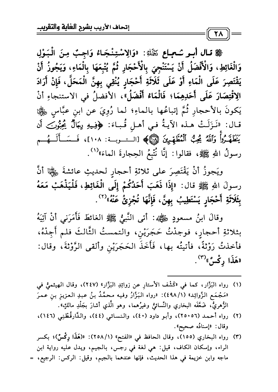 قال أبو شجاع رحمه الله: «وَالِاسْتِنْجَاءُ وَاجِبٌ مِنَ الْبَوْلِ وَالْغَائِطِ، وَالْأَفْضَلُ أَنْ يَسْتَنْجِيَ بِالْأَحْجَارِ ثُمَّ يُتْبِعَهَا بِالْمَاءِ، وَيَجُوزُ أَنْ يَقْتَصِرَ عَلَى الْمَاءِ أَوْ عَلَى ثَلَاثَةِ أَحْجَارٍ يُنْقِي بِهِنَّ الْمَحَلَّ، فَإِنْ أَرَادَ الِاقْتِصَارَ عَلَى أَحَدِهِمَا، فَالْمَاءُ أَفْضَلُ»، الأفضلُ في الاستنجاءِ أنْ يَكونَ بالأحجارِ ثُمَّ إتباعُها بالماءِ؛ لما رُوِيَ عن ابنِ عبَّاسٍ رضي الله عنهما قال: «نَزَلَتْ هذه الآيةُ في أهلِ قُباءَ: {فِيهِ رِجَالٌ يُحِبُّونَ أَنْ يَتَطَهَّرُوا وَاللهُ يُحِبُّ الْمُطَّهِّرِينَ} [التوبة: ١٠٨]، فَسَأَلَهُم رسولُ اللهِ صلى الله عليه وسلم، فقالوا: إنَّا نُتْبِعُ الحِجارةَ الماءَ (¬١).
